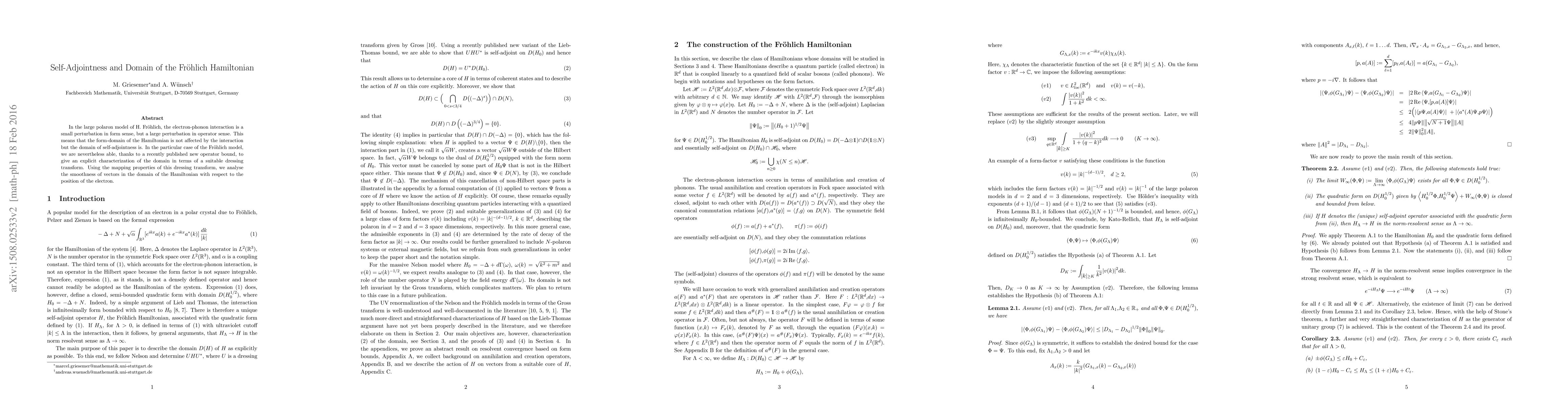 This paper explores the self-adjointness and domain of the Froehlich Hamiltonian in the context of electron-phonon interactions, demonstrating that while the form-domain remains unaffected, the domain of self-adjointness is altered. An explicit characterization of this domain is provided using a new operator bound and a dressing transform, which also helps analyze the smoothness of vectors in the Hamiltonian's domain concerning the electron's position.