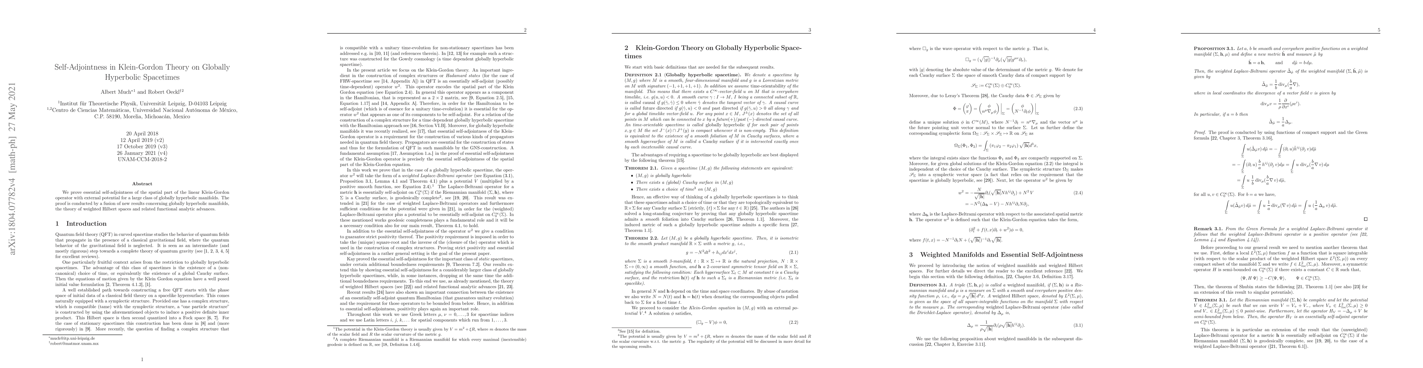 The paper proves essential self-adjointness of the Klein-Gordon operator's spatial part in globally hyperbolic spacetimes, leveraging new findings on manifold properties, weighted Hilbert spaces, and functional analysis. This fusion of results advances the understanding of the operator's behavior in such complex geometries.