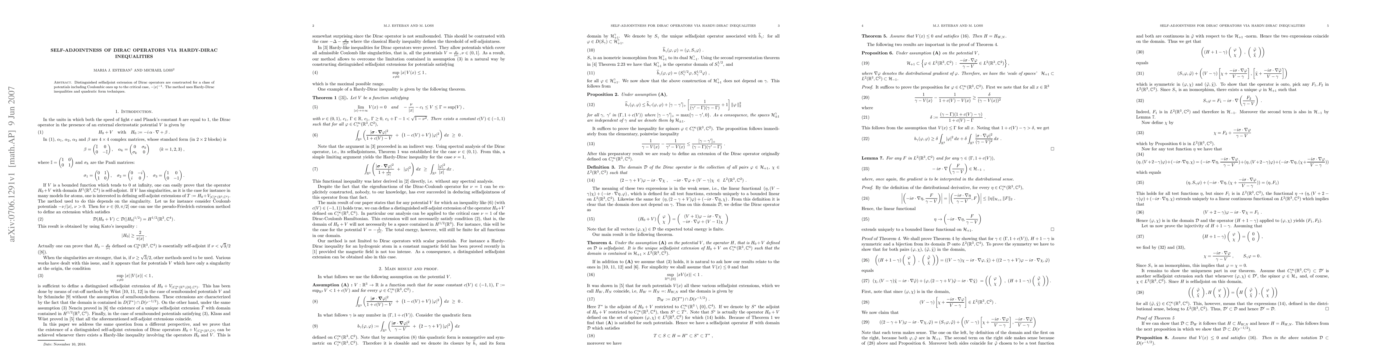 This paper constructs distinguished selfadjoint extensions of Dirac operators for potentials including Coulombic ones, up to the critical case of $-|x|^{-1}$, utilizing Hardy-Dirac inequalities and quadratic form techniques. The method provides a robust framework for addressing self-adjointness issues in quantum mechanics.