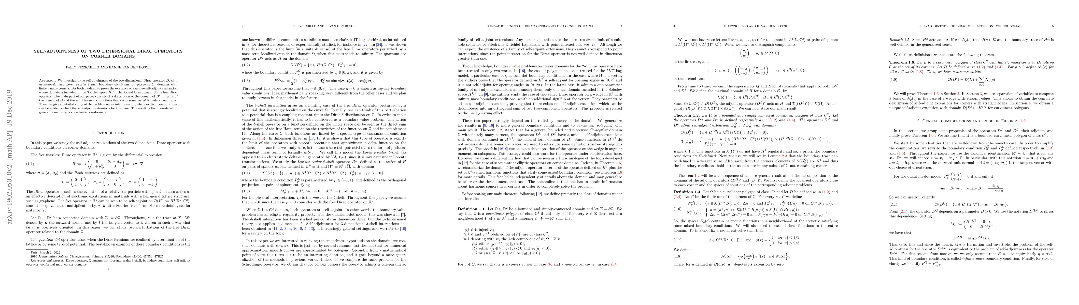 This paper investigates the self-adjointness of the two-dimensional Dirac operator on piecewise smooth domains with corners, proving the existence of a unique self-adjoint realization under specific quantum-dot and Lorentz-scalar boundary conditions. It details the domain of the adjoint operator through mixed boundary conditions and provides explicit computations for an infinite sector before generalizing the results.