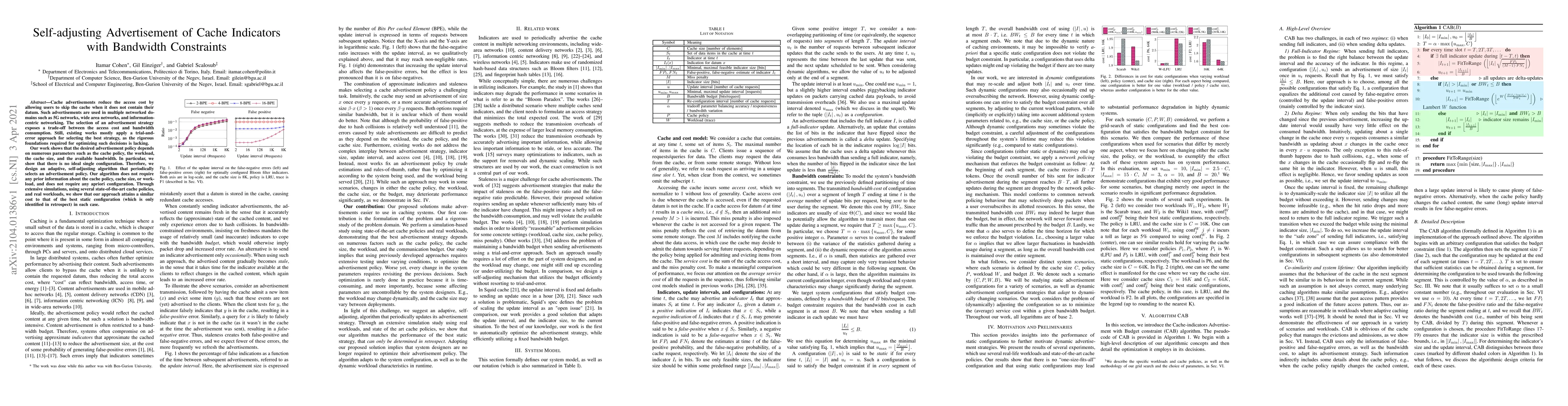 A self-adjusting algorithm is designed to optimize advertisement policies for cache indicators with bandwidth constraints in networked domains, achieving similar access costs as the best static configuration through extensive simulations.