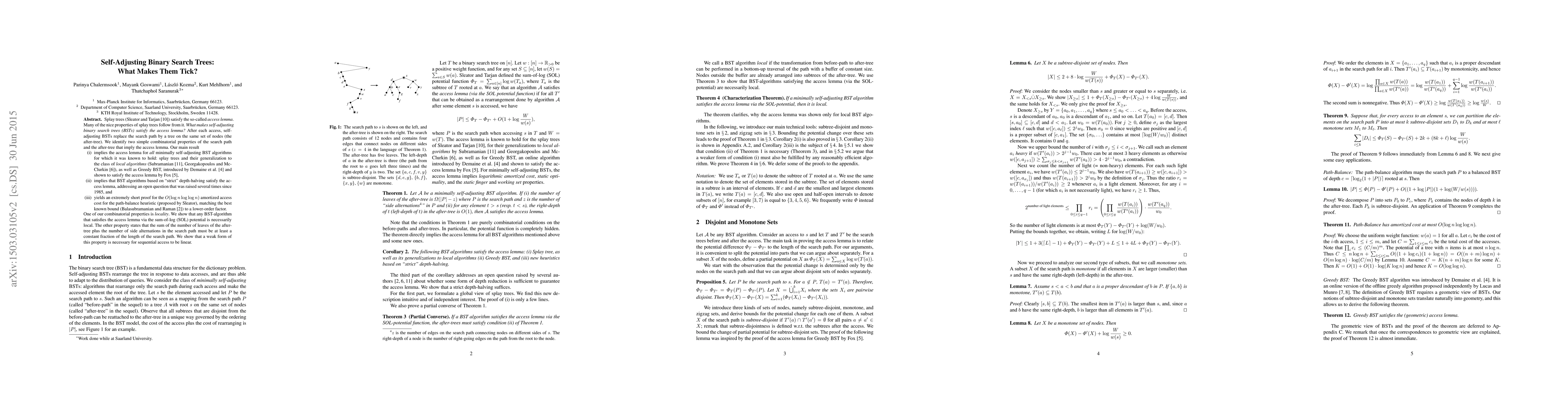 This paper identifies two combinatorial properties—locality and side alternation—that explain why self-adjusting binary search trees satisfy the access lemma. The authors demonstrate that these properties apply to various self-adjusting BST algorithms, including splay trees and Greedy BST, and provide a concise proof for the optimal amortized access cost.
