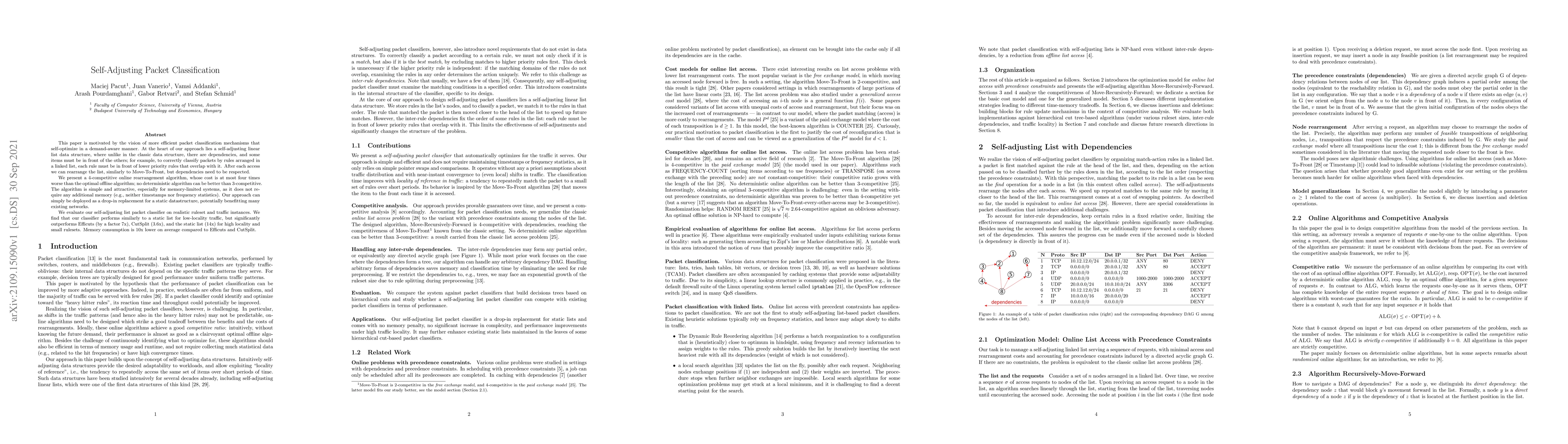 This paper is motivated by the vision of more efficient packet classification mechanisms that self-optimize in a demand-aware manner. At the heart of our approach lies a self-adjusting linear list data structure, where unlike in the classic data structure, there are dependencies, and some items must be in front of the others; for example, to correctly classify packets by rules arranged in a linked list, each rule must be in front of lower priority rules that overlap with it. After each access we can rearrange the list, similarly to Move-To-Front, but dependencies need to be respected. We present a 4-competitive online rearrangement algorithm, whose cost is at most four times worse than the optimal offline algorithm; no deterministic algorithm can be better than 3-competitive. The algorithm is simple and attractive, especially for memory-limited systems, as it does not require any additional memory (e.g., neither timestamps nor frequency statistics). Our approach can simply be deployed as a drop-in replacement for a static datastructure, potentially benefitting many existing networks. We evaluate our self-adjusting list packet classifier on realistic ruleset and traffic instances. We find that our classifier performs similarly to a static list for low-locality traffic, but significantly outperforms Efficuts (by a factor 7x), CutSplit (3.6x), and the static list (14x) for high locality and small rulesets. Memory consumption is 10x lower on average compared to Efficuts and CutSplit.