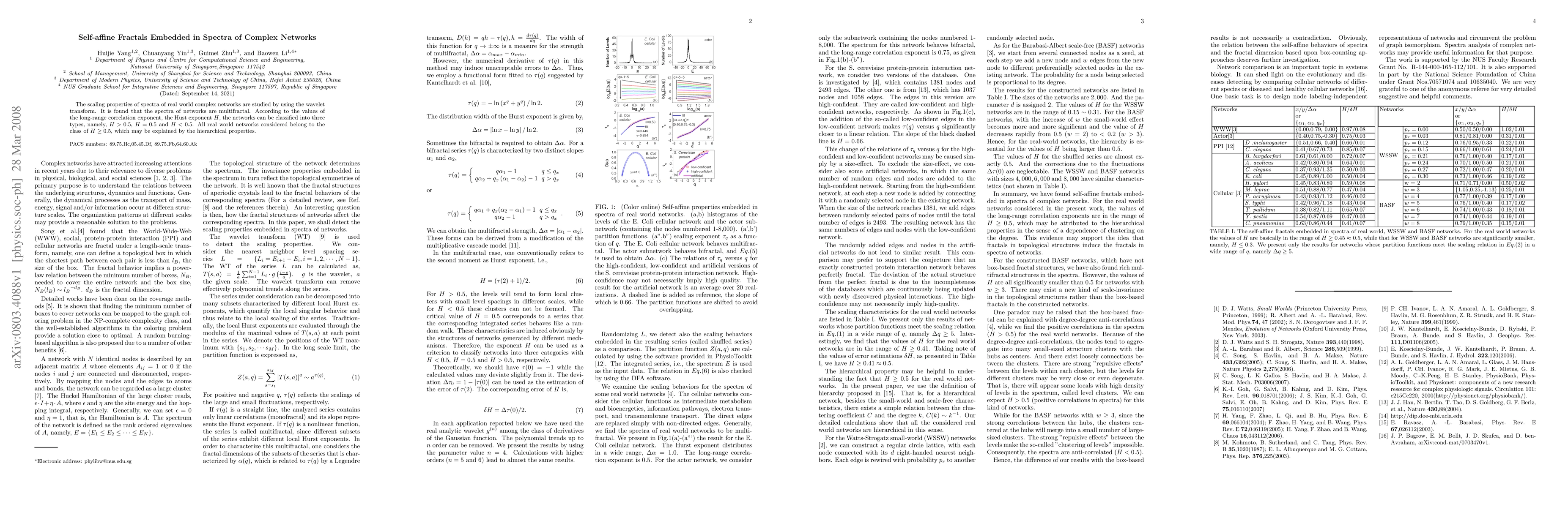 The scaling properties of spectra of real world complex networks are studied by using the wavelet transform. It is found that the spectra of networks are multifractal. According to the values of the long-range correlation exponent, the Hust exponent $H$, the networks can be classified into three types, namely, $H>0.5$, $H=0.5$ and $H<0.5$. All real world networks considered belong to the class of $H \ge 0.5$, which may be explained by the hierarchical properties.