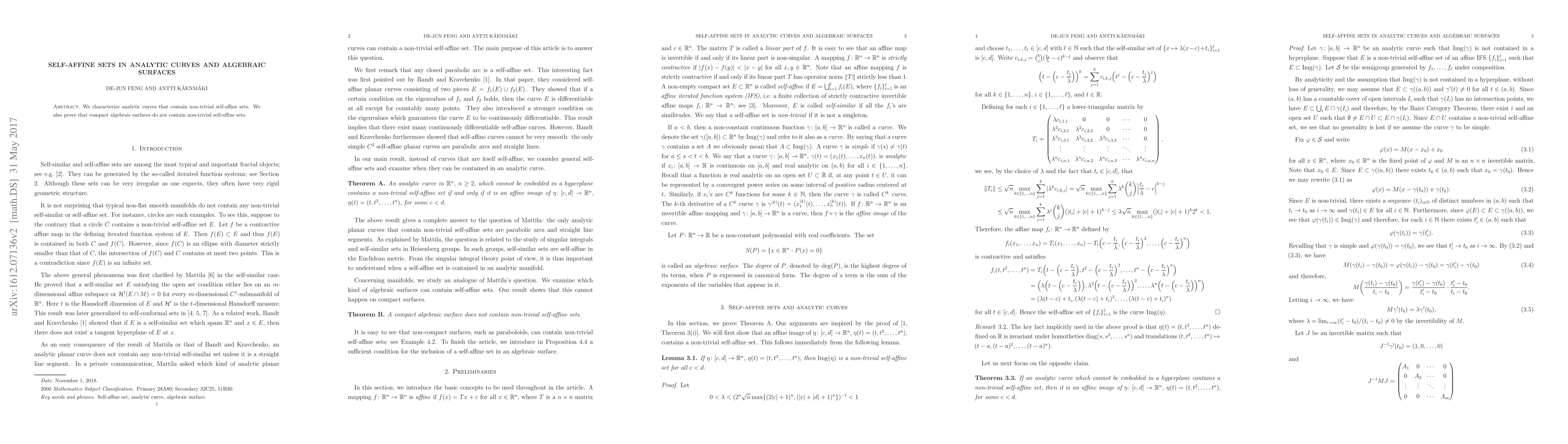 Summary: This paper identifies analytic curves that possess non-trivial self-affine sets and demonstrates that compact algebraic surfaces do not contain such sets. The study provides a clear distinction between the properties of analytic curves and algebraic surfaces regarding self-affine sets.