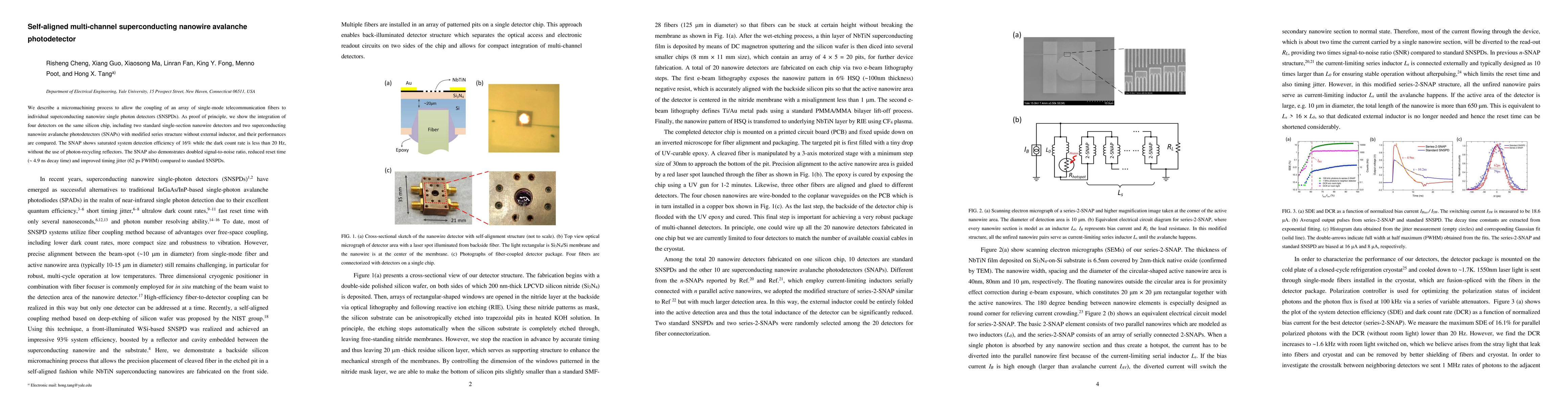 We describe a micromachining process to allow the coupling of an array of single-mode telecommunication fibers to individual superconducting nanowire single photon detectors (SNSPDs). As proof of principle, we show the integration of four detectors on the same silicon chip, including two standard single-section nanowire detectors and two superconducting nanowire avalanche photodetectors (SNAPs) with modified series structure without external inductor, and their performances are compared. The SNAP shows saturated system detection efficiency of 16% while the dark count rate is less than 20 Hz, without the use of photon-recycling reflectors. The SNAP also demonstrates doubled signal-to-noise ratio, reduced reset time (~ 4.9 ns decay time) and improved timing jitter (62 ps FWHM) compared to standard SNSPDs.