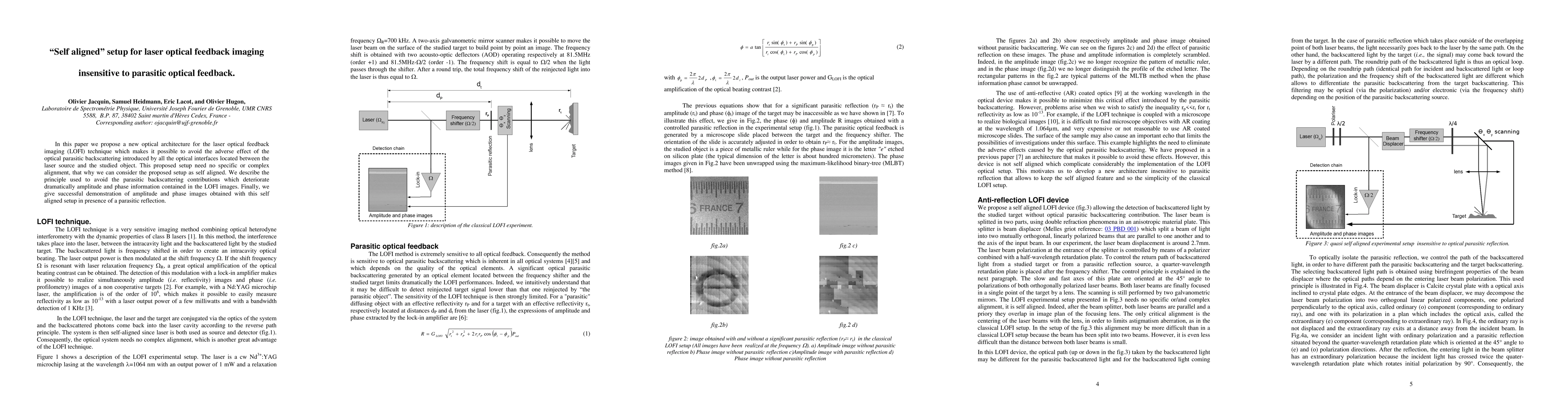 This paper proposes a self-aligned optical architecture for laser optical feedback imaging (LOFI) that effectively eliminates adverse effects from parasitic optical feedback. The new setup avoids complex alignment and successfully demonstrates improved amplitude and phase imaging despite parasitic reflections.