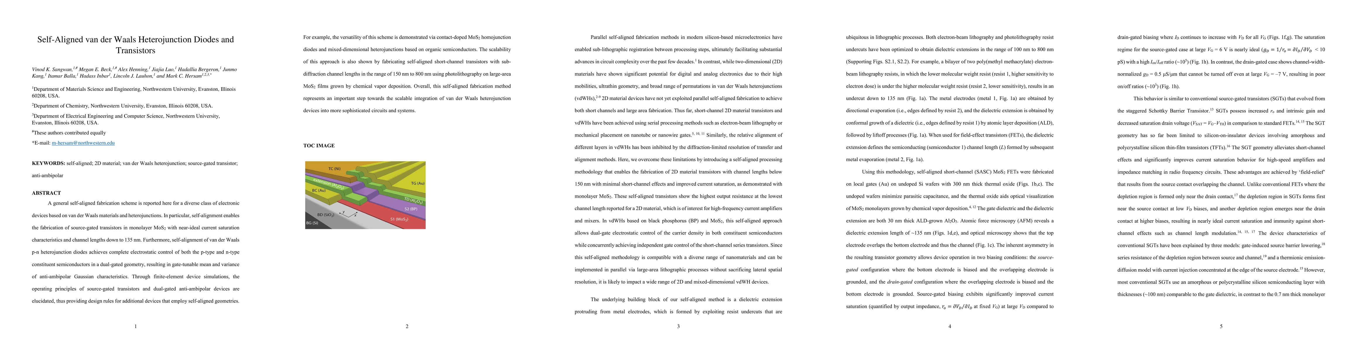 This research introduces a self-aligned fabrication method for van der Waals heterojunction diodes and transistors, achieving near-ideal current characteristics and gate-tunable anti-ambipolar properties, demonstrating scalability down to 135 nm channel lengths and supporting the integration of diverse electronic devices.