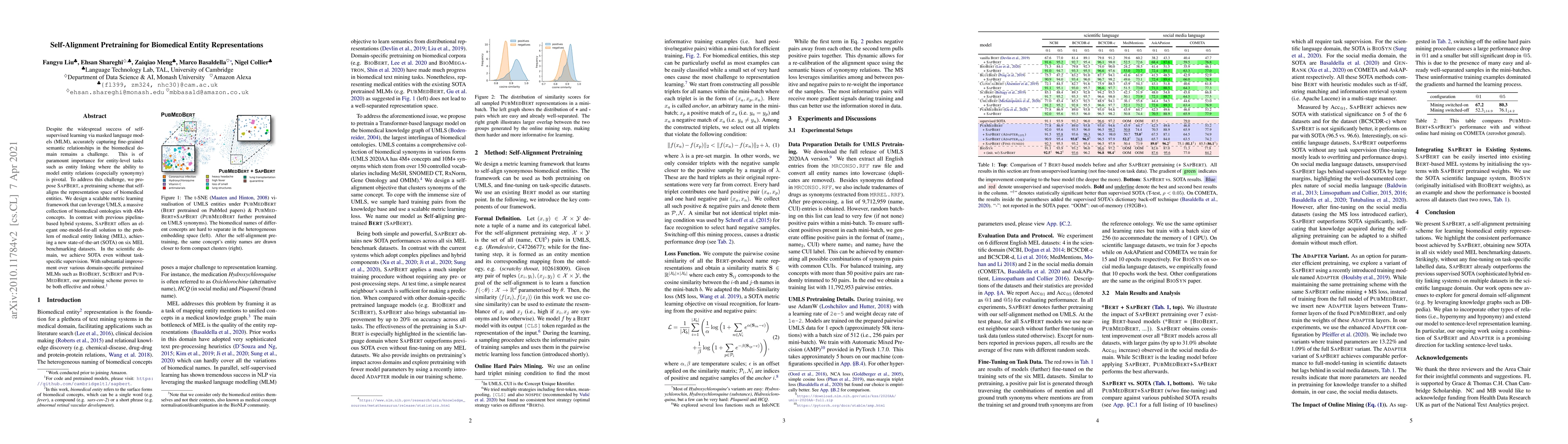 Despite the widespread success of self-supervised learning via masked language models (MLM), accurately capturing fine-grained semantic relationships in the biomedical domain remains a challenge. This is of paramount importance for entity-level tasks such as entity linking where the ability to model entity relations (especially synonymy) is pivotal. To address this challenge, we propose SapBERT, a pretraining scheme that self-aligns the representation space of biomedical entities. We design a scalable metric learning framework that can leverage UMLS, a massive collection of biomedical ontologies with 4M+ concepts. In contrast with previous pipeline-based hybrid systems, SapBERT offers an elegant one-model-for-all solution to the problem of medical entity linking (MEL), achieving a new state-of-the-art (SOTA) on six MEL benchmarking datasets. In the scientific domain, we achieve SOTA even without task-specific supervision. With substantial improvement over various domain-specific pretrained MLMs such as BioBERT, SciBERTand and PubMedBERT, our pretraining scheme proves to be both effective and robust.