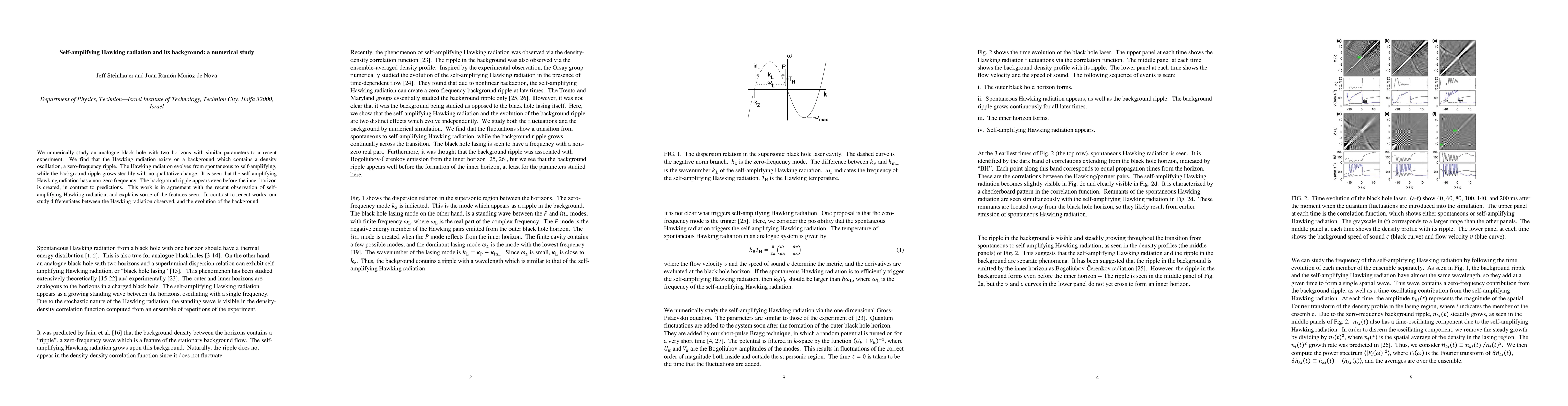 We numerically study an analogue black hole with two horizons with similar parameters to a recent experiment. We find that the Hawking radiation exists on a background which contains a density oscillation, a zero-frequency ripple. The Hawking radiation evolves from spontaneous to self-amplifying, while the background ripple grows steadily with no qualitative change. It is seen that the self-amplifying Hawking radiation has a non-zero frequency. The background ripple appears even before the inner horizon is created, in contrast to predictions. This work is in agreement with the recent observation of self-amplifying Hawking radiation, and explains some of the features seen. In contrast to recent works, our study differentiates between the Hawking radiation observed, and the evolution of the background.