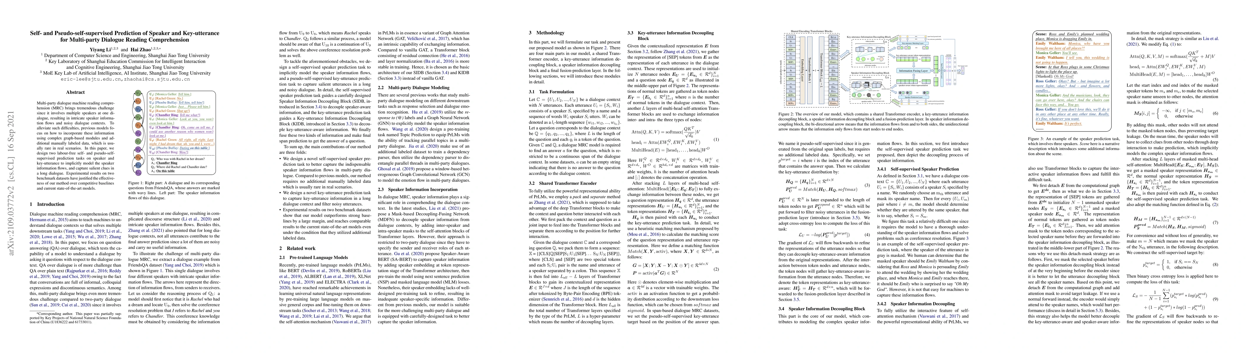 This paper proposes self- and pseudo-self-supervised prediction tasks to implicitly model speaker information flows in multi-party dialogue reading comprehension without requiring manual annotations. The approach captures salient clues and outperforms existing models on benchmark datasets.