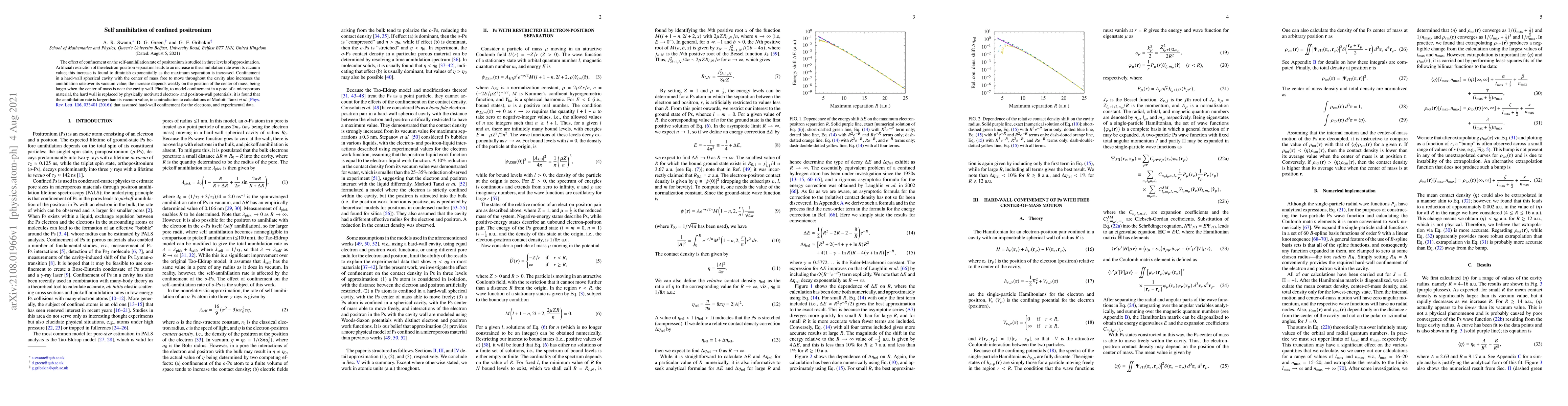 The effect of confinement on the self-annihilation rate of positronium is studied in three levels of approximation. Artificial restriction of the electron-positron separation leads to an increase in the annihilation rate over its vacuum value; this increase is found to diminish exponentially as the maximum separation is increased. Confinement in a hard-wall spherical cavity with the center of mass free to move throughout the cavity also increases the annihilation rate over its vacuum value; the increase depends weakly on the position of the center of mass, being larger when the center of mass is near the cavity wall. Finally, to model confinement in a pore of a microporous material, the hard wall is replaced by physically motivated electron- and positron-wall potentials; it is found that the annihilation rate is larger than its vacuum value, in contradiction to calculations of Marlotti Tanzi et al. [Phys. Rev. Lett. 116, 033401 (2016)] that assumed hard-wall confinement for the electrons, and experimental data.