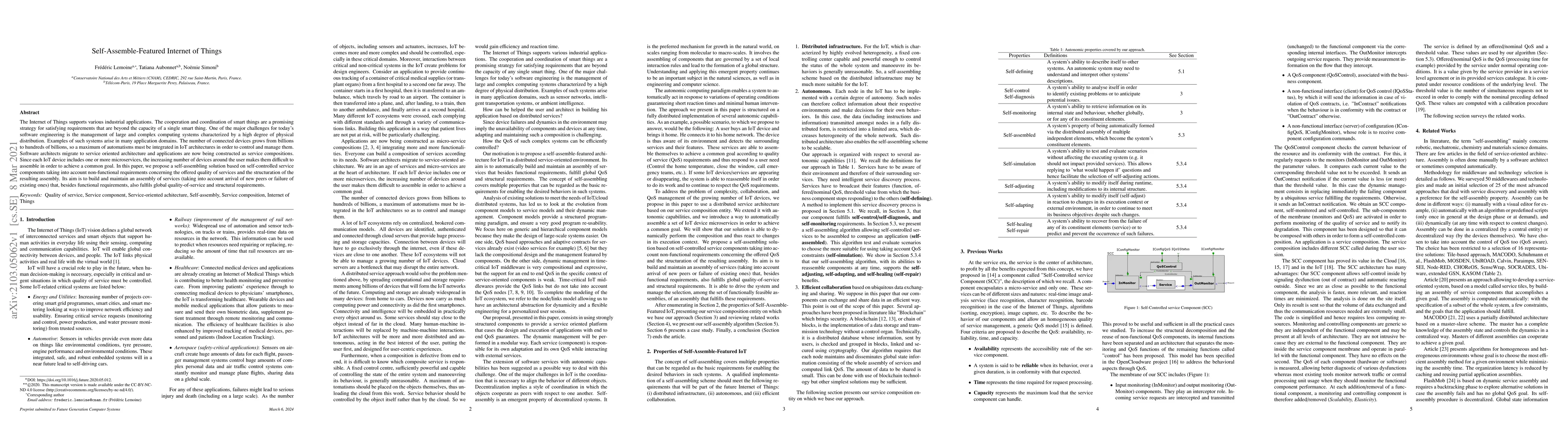 The Internet of Things supports various industrial applications. The cooperation and coordination of smart things are a promising strategy for satisfying requirements that are beyond the capacity of a single smart thing. One of the major challenges for today's software engineering is the management of large and complex computing systems characterized by a high degree of physical distribution. Examples of such systems arise in many application domains. The number of connected devices grows from billions to hundreds of billions, so a maximum of automatisms must be integrated in IoT architectures in order to control and manage them. Software architects migrate to service oriented architecture and applications are now being constructed as service compositions. Since each IoT device includes one or more microservices, the increasing number of devices around the user makes them difficult to assemble in order to achieve a common goal. In this paper, we propose a self-assembling solution based on self-controlled service components taking into account non-functional requirements concerning the offered quality of services and the structuration of the resulting assembly. Its aim is to build and maintain an assembly of services (taking into account arrival of new peers or failure of existing ones) that, besides functional requirements, also fulfils global quality-of-service and structural requirements.