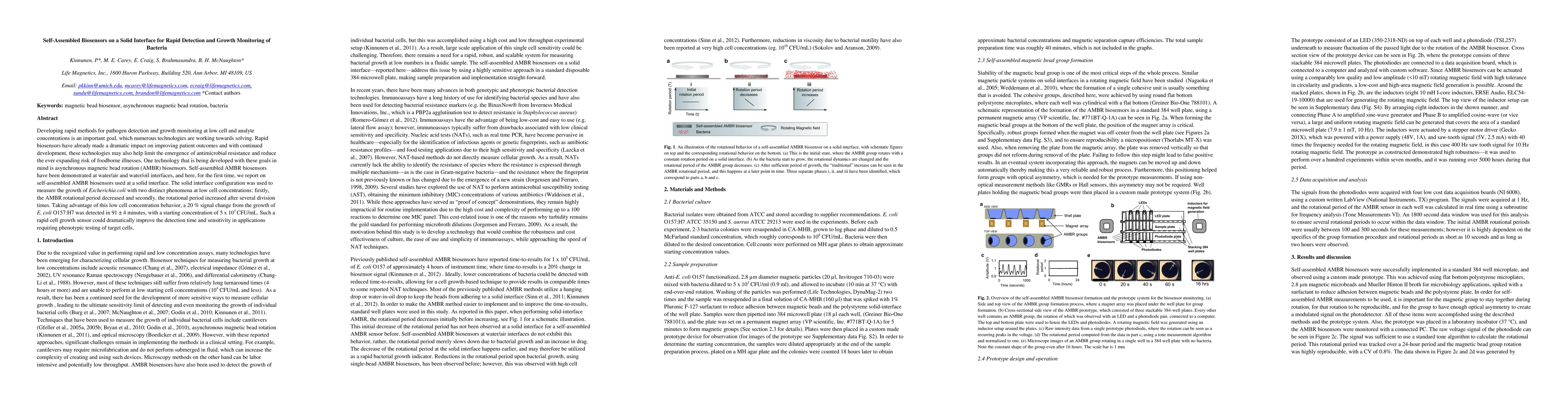 Developing rapid methods for pathogen detection and growth monitoring at low cell and analyte concentrations is an important goal, which numerous technologies are working towards solving. Rapid biosensors have already made a dramatic impact on improving patient outcomes and with continued development, these technologies may also help limit the emergence of antimicrobial resistance and reduce the ever expanding risk of foodborne illnesses. One technology that is being developed with these goals in mind is asynchronous magnetic bead rotation (AMBR) biosensors. Self-assembled AMBR biosensors have been demonstrated at water/air and water/oil interfaces, and here, for the first time, we report on self-assembled AMBR biosensors used at a solid interface. The solid interface configuration was used to measure the growth of Escherichia coli with two distinct phenomena at low cell concentrations: firstly, the AMBR rotational period decreased and secondly, the rotational period increased after several division times. Taking advantage of this low cell concentration behavior, a 20% signal change from the growth of E. coli O157:H7 was detected in 91 \pm 4 minutes, with a starting concentration of 5 x 103 CFU/mL. Such a rapid cell growth sensor could dramatically improve the detection time and sensitivity in applications requiring phenotypic testing of target cells.