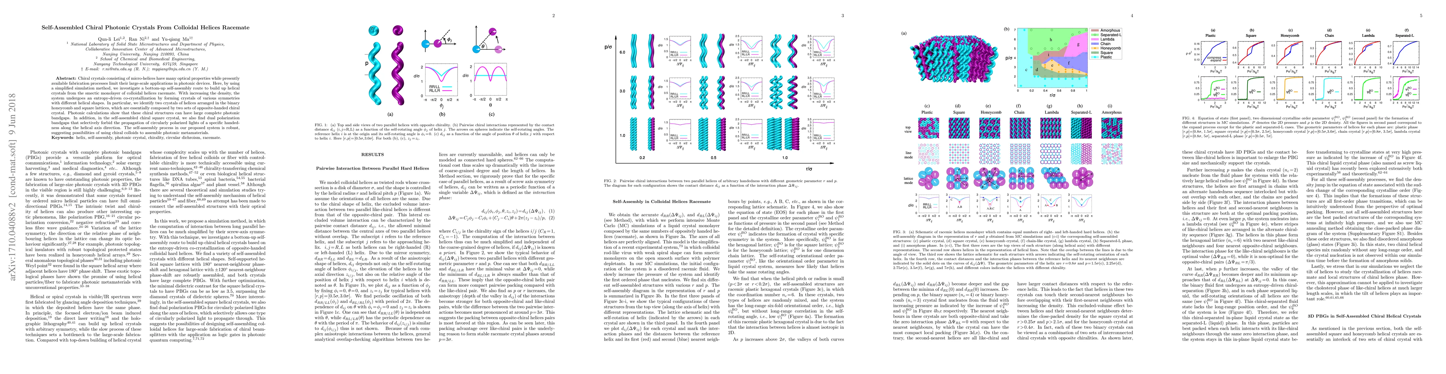 This research explores a self-assembly method to create chiral photonic crystals from colloidal helices racemate, identifying two symmetrical crystals with large photonic bandgaps and dual polarization bandgaps, indicating potential for photonic devices. The proposed bottom-up assembly process is robust, suggesting applications in photonic metamaterials.