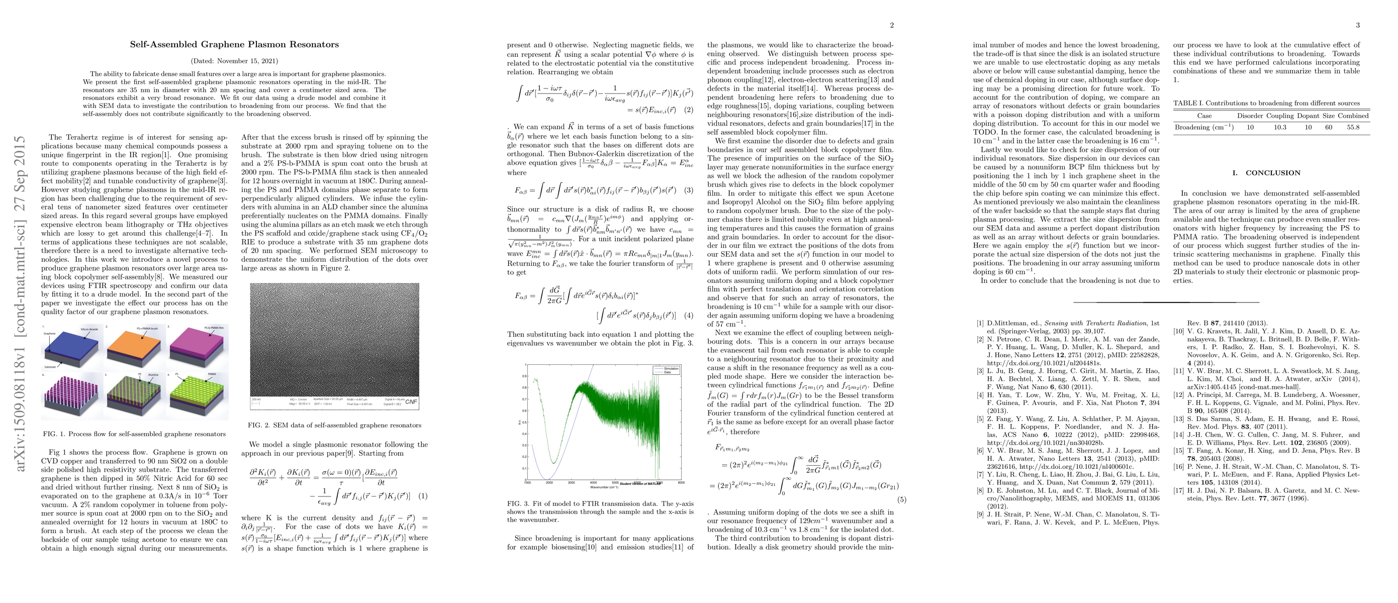 The ability to fabricate dense small features over a large area is important for graphene plasmonics. We present the first self-assembled graphene plasmonic resonators operating in the mid-IR. The resonators are 35 nm in diameter with 20 nm spacing and cover a centimeter sized area. The resonators exhibit a very broad resonance. We fit our data using a drude model and combine it with SEM data to investigate the contribution to broadening from our process. We find that the self-assembly does not contribute significantly to the broadening observed.