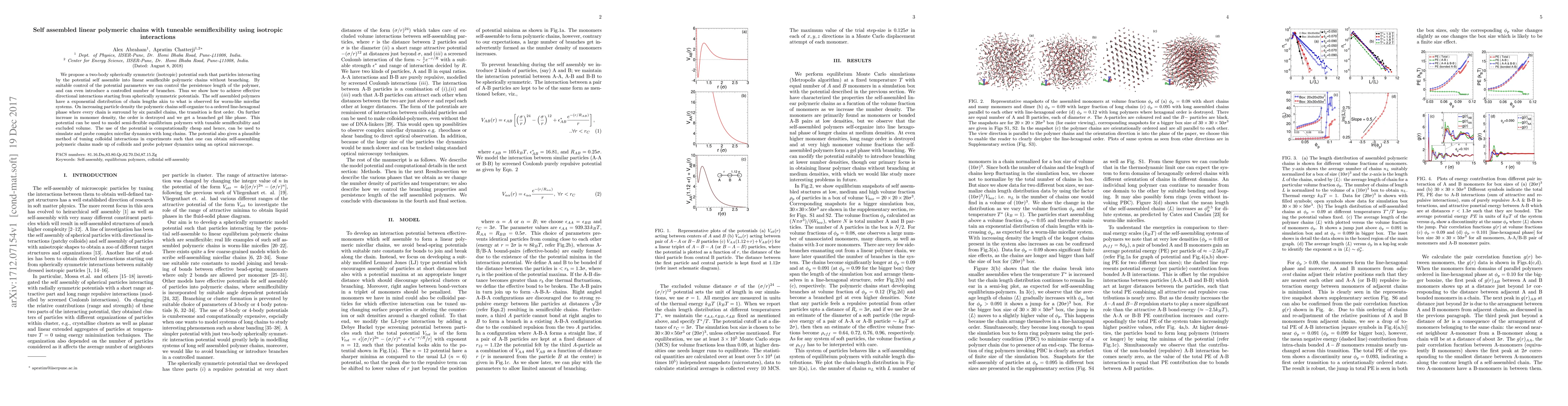 This paper proposes a spherically symmetric potential that enables self-assembly of linear semiflexible polymeric chains without branching. By adjusting potential parameters, the persistence length and branching can be controlled, allowing for effective directional interactions from isotropic potentials.