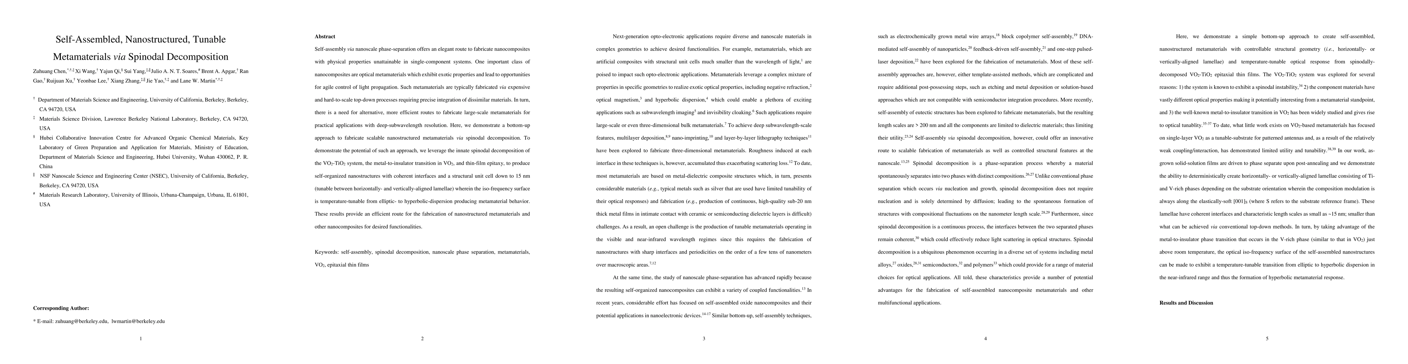 This paper presents a bottom-up method using spinodal decomposition to fabricate scalable, tunable nanostructured metamaterials from VO2-TiO2 systems, achieving deep-subwavelength resolution and enabling temperature-tunable metamaterial behavior through self-organized nanostructures. This approach offers a cost-effective alternative to traditional top-down fabrication methods.
