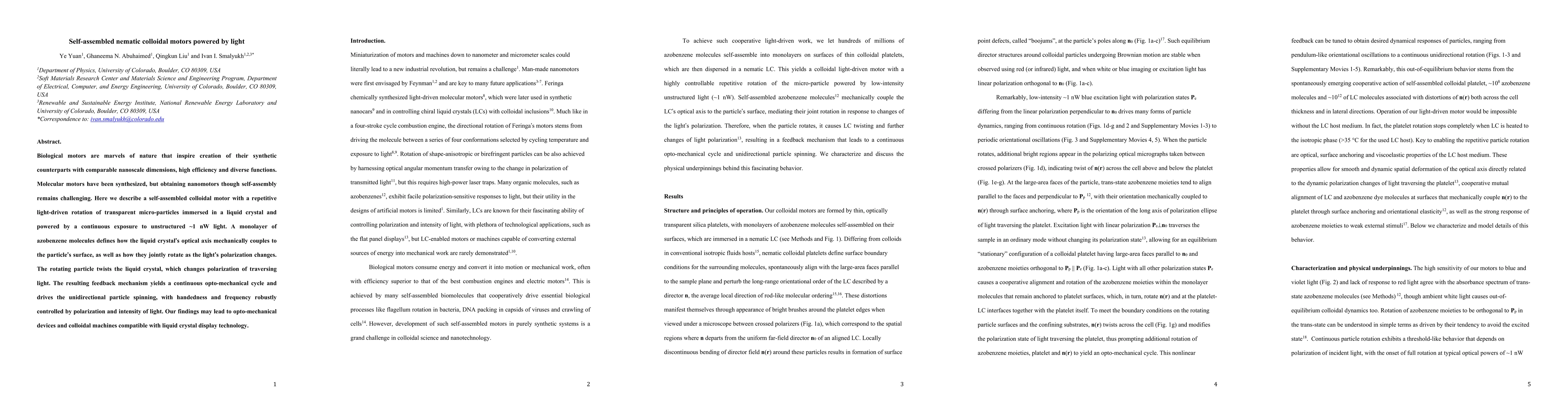 This paper presents a self-assembled colloidal motor that rotates continuously under light exposure, driven by a feedback mechanism between a liquid crystal and a monolayer of azobenzene molecules. The motor's rotation and speed are controlled by the light's polarization and intensity, potentially enabling new opto-mechanical devices.