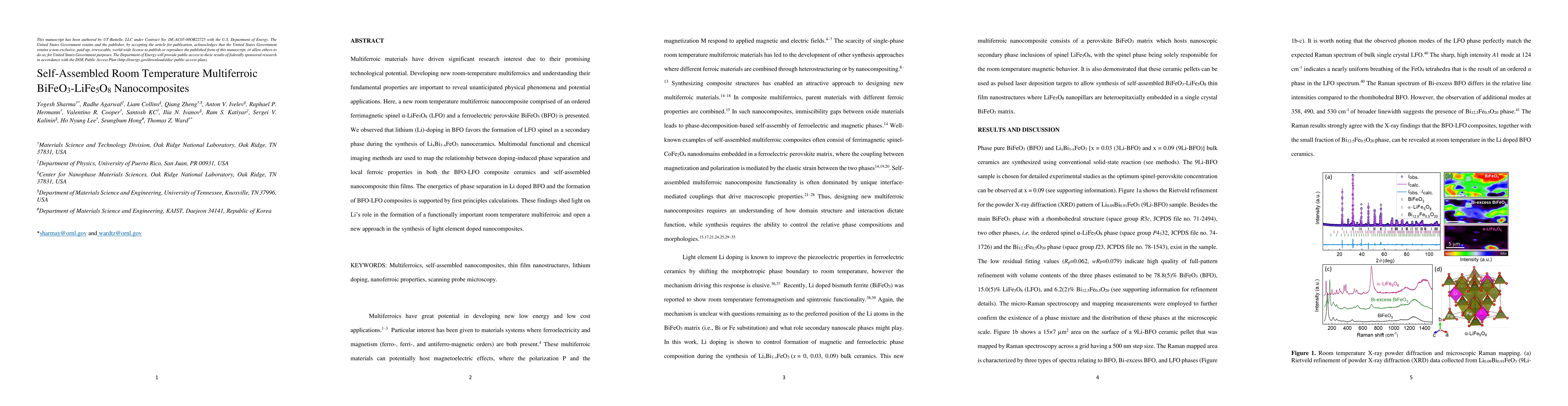 This research introduces a novel room temperature multiferroic nanocomposite made of ordered ferrimagnetic spinel LiFe5O8 and ferroelectric perovskite BiFeO3. The study finds that lithium doping in BiFeO3 favors the formation of LiFe5O8 during synthesis, revealing a new approach to creating multiferroic materials with significant technological potential.