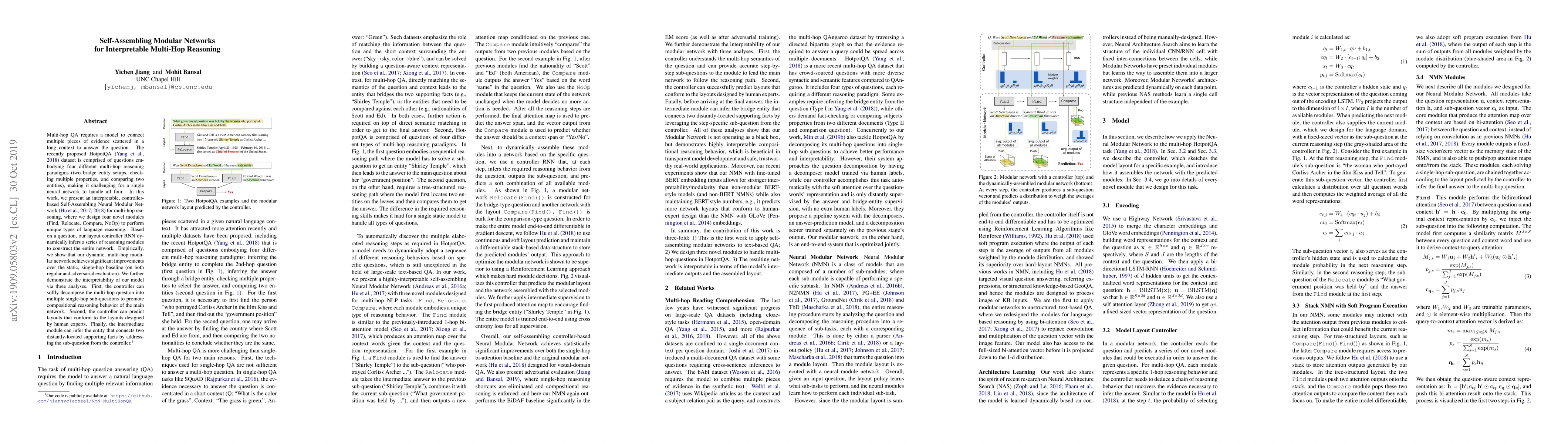 This paper proposes a Self-Assembling Neural Modular Network for interpretable multi-hop reasoning, utilizing four specialized modules to dynamically construct a network tailored to specific reasoning tasks. The model significantly outperforms static baselines and demonstrates interpretability through its ability to decompose complex questions and mimic human-designed reasoning layouts.