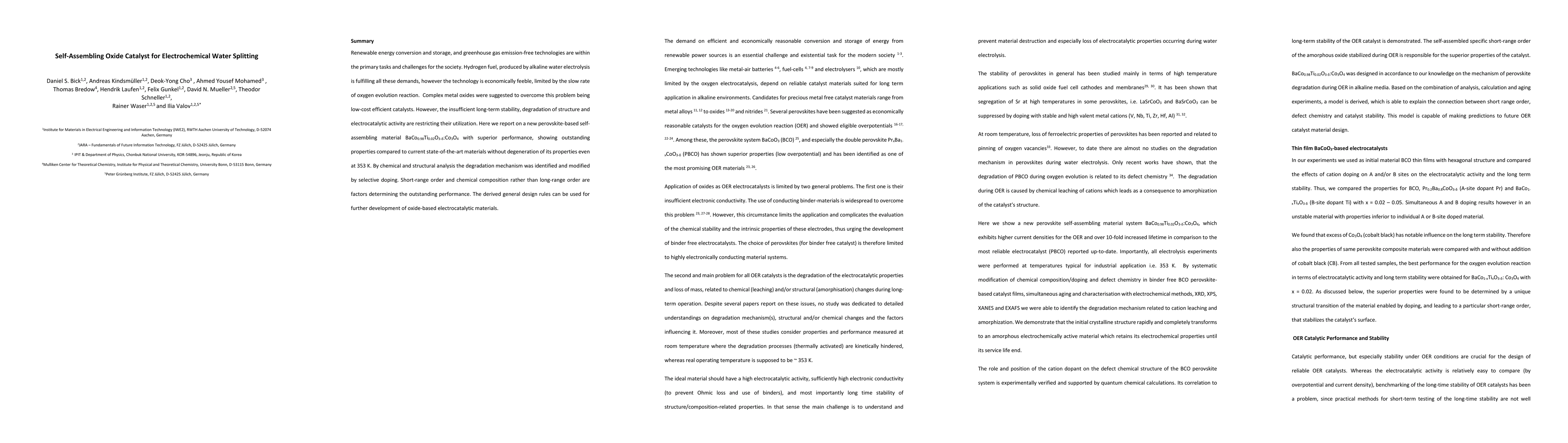 Renewable energy conversion and storage, and greenhouse gas emission-free technologies are within the primary tasks and challenges for the society. Hydrogen fuel, produced by alkaline water electrolysis is fulfilling all these demands, however the technology is economically feeble, limited by the slow rate of oxygen evolution reaction. Complex metal oxides were suggested to overcome this problem being low-cost efficient catalysts. However, the insufficient long-term stability, degradation of structure and electrocatalytic activity are restricting their utilization. Here we report on a new perovskite-based self-assembling material BaCo0.98Ti0.02O3-$\delta$:Co3O4 with superior performance, showing outstanding properties compared to current state-of-the-art materials without degeneration of its properties even at 353 K. By chemical and structural analysis the degradation mechanism was identified and modified by selective doping. Short-range order and chemical composition rather than long-range order are factors determining the outstanding performance. The derived general design rules can be used for further development of oxide-based electrocatalytic materials.