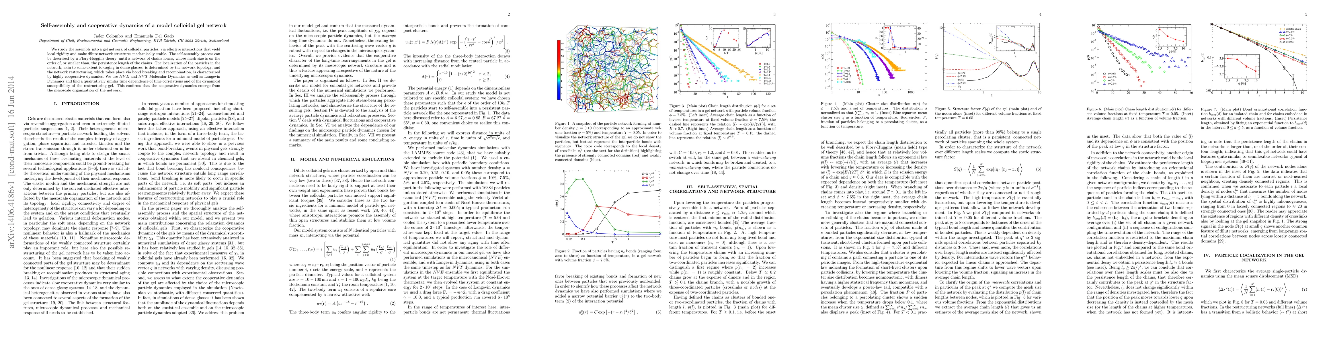 We study the assembly into a gel network of colloidal particles, via effective interactions that yield local rigidity and make dilute network structures mechanically stable. The self-assembly process can be described by a Flory-Huggins theory, until a network of chains forms, whose mesh size is on the order of, or smaller than, the persistence length of the chains. The localization of the particles in the network, akin to some extent to caging in dense glasses, is determined by the network topology, and the network restructuring, which takes place via bond breaking and recombination, is characterized by highly cooperative dynamics. We use NVE and NVT Molecular Dynamics as well as Langevin Dynamics and find a qualitatively similar time dependence of time correlations and of the dynamical susceptibility of the restructuring gel. This confirms that the cooperative dynamics emerge from the mesoscale organization of the network.