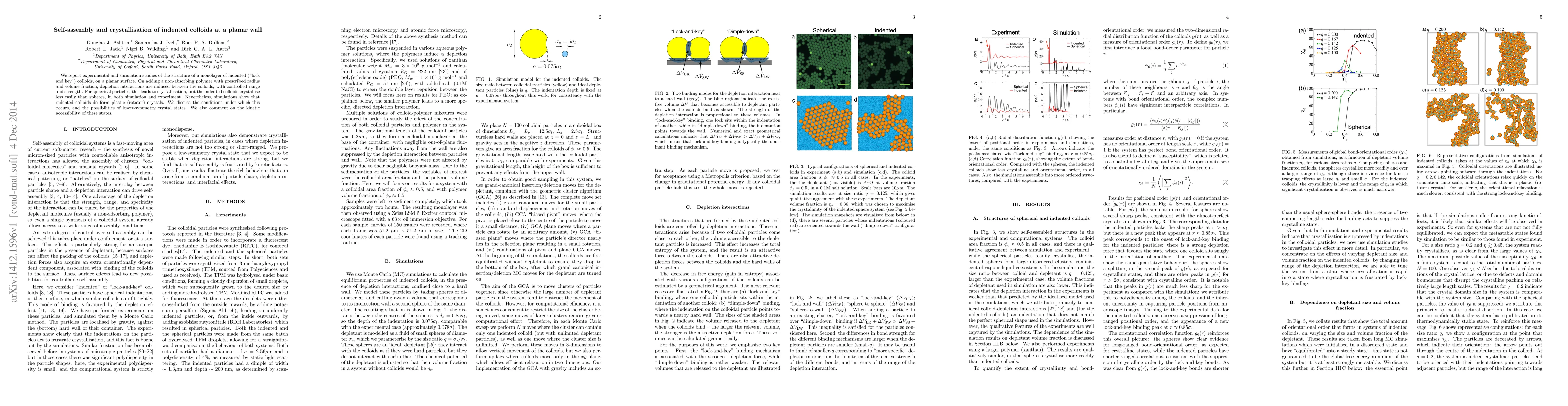 This paper investigates the self-assembly behavior of indented ("lock and key") colloids on a planar surface, revealing that while they crystallise less easily than spherical particles, they can form plastic rotator crystals under specific conditions. The study combines experimental and simulation approaches to explore the kinetic accessibility and potential lower-symmetry crystal states of these unique colloids.