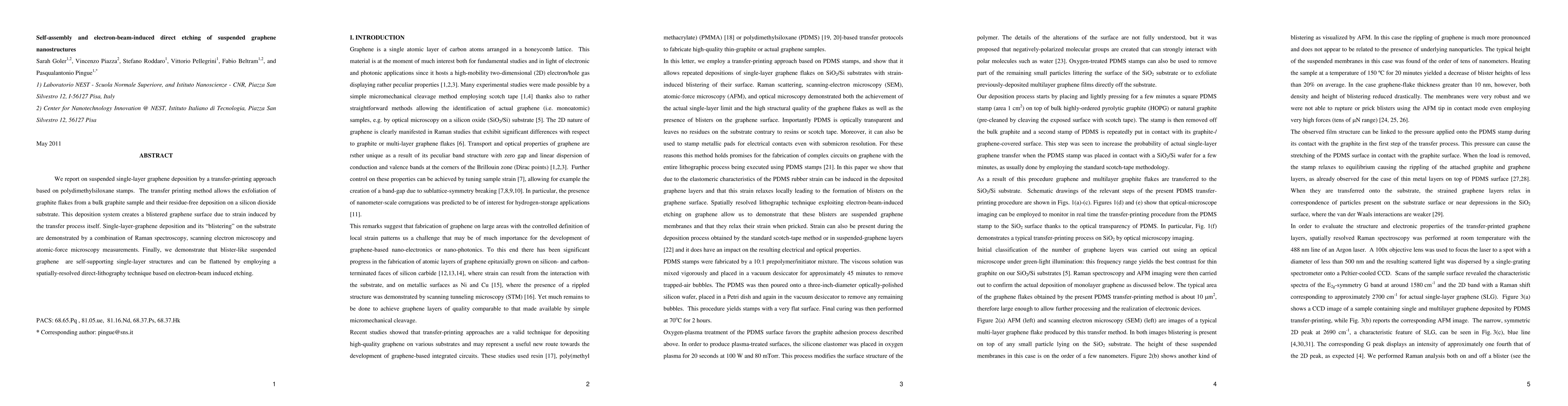 This paper details a method for depositing suspended single-layer graphene using a transfer-printing technique with PDMS stamps, which results in a blistered graphene surface. The authors show that these structures can be flattened via electron-beam-induced direct etching, confirming their self-supporting nature.
