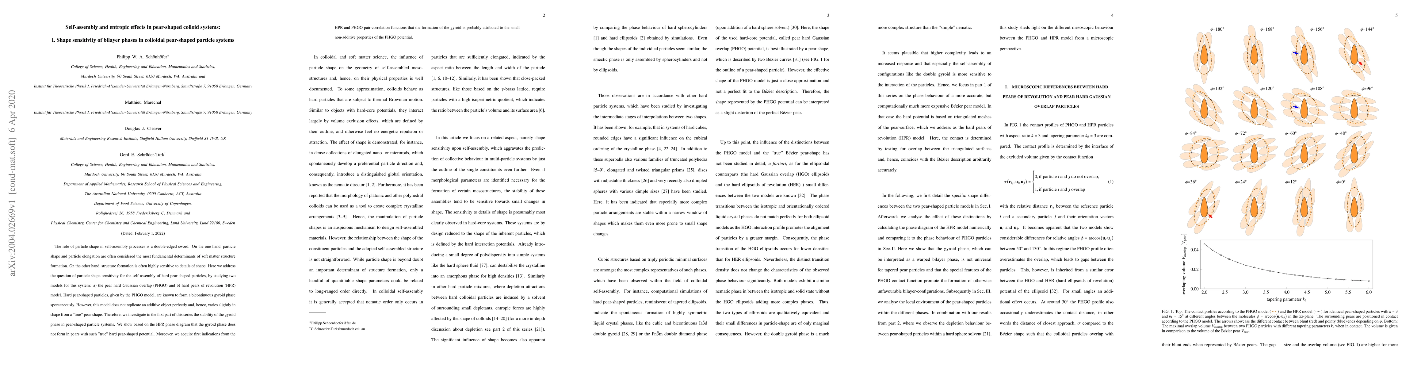 The role of particle shape in self-assembly processes is a double-edged sword. On the one hand, particle shape and particle elongation are often considered the most fundamental determinants of soft matter structure formation. On the other hand, structure formation is often highly sensitive to details of shape. Here we address the question of particle shape sensitivity for the self-assembly of hard pear-shaped particles, by studying two models for this system: a) the pear hard Gaussian overlap (PHGO) and b) hard pears of revolution (HPR) model. Hard pear-shaped particles, given by the PHGO model, are known to form a bicontinuous gyroid phase spontaneously. However, this model does not replicate an additive object perfectly and, hence, varies slightly in shape from a "true" pear-shape. Therefore, we investigate in the first part of this series the stability of the gyroid phase in pear-shaped particle systems. We show based on the HPR phase diagram that the gyroid phase does not form in pears with such "true" hard pear-shaped potential. Moreover, we acquire first indications from the HPR and PHGO pair-correlation functions that the formation of the gyroid is probably attributed to the small non-additive properties of the PHGO potential.