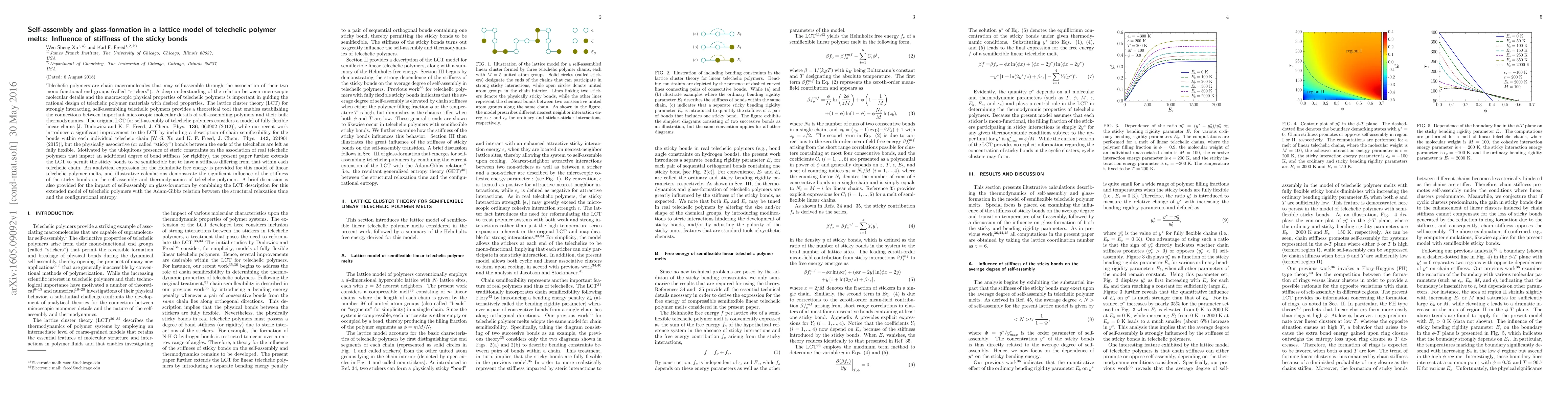 This paper extends the lattice cluster theory (LCT) to include semiflexible "sticky" bonds between telechelic polymers, exploring the impact of bond stiffness on self-assembly and thermodynamics. The study reveals significant effects of sticky bond stiffness on polymer melt behavior and discusses its implications for glass-formation.
