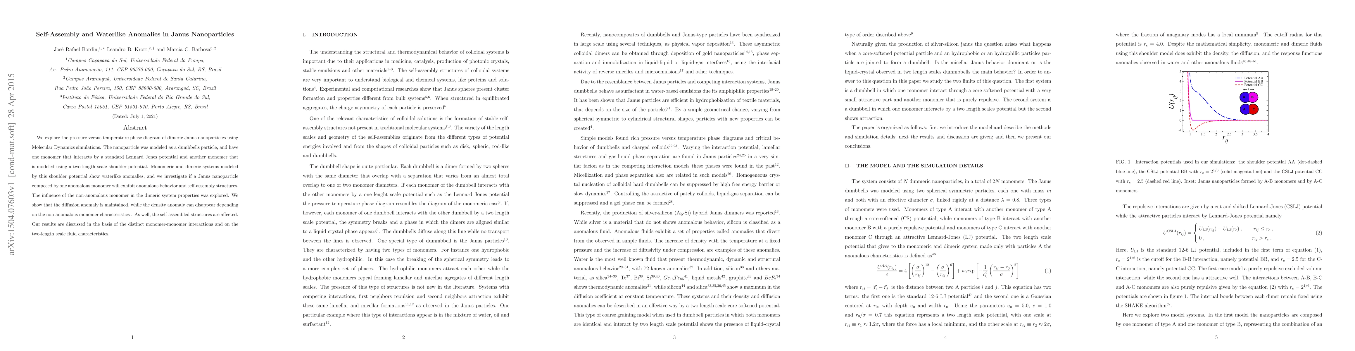 We explore the pressure versus temperature phase diagram of dimeric Janus nanoparticles using Molecular Dynamics simulations. The nanoparticle was modeled as a dumbbells particle, and have one monomer that interacts by a standard Lennard Jones potential and another monomer that is modeled using a two-length scale shoulder potential. Monomeric and dimeric systems modeled by this shoulder potential show waterlike anomalies, and we investigate if a Janus nanoparticle composed by one anomalous monomer will exhibit anomalous behavior and self-assembly structures. The influence of the non-anomalous monomer in the dimeric system properties was explored. We show that the diffusion anomaly is maintained, while the density anomaly can disappear depending on the non-anomalous monomer characteristics. As well, the self-assembled structures are affected. Our results are discussed in the basis of the distinct monomer-monomer interactions and on the two-length scale fluid characteristics.
