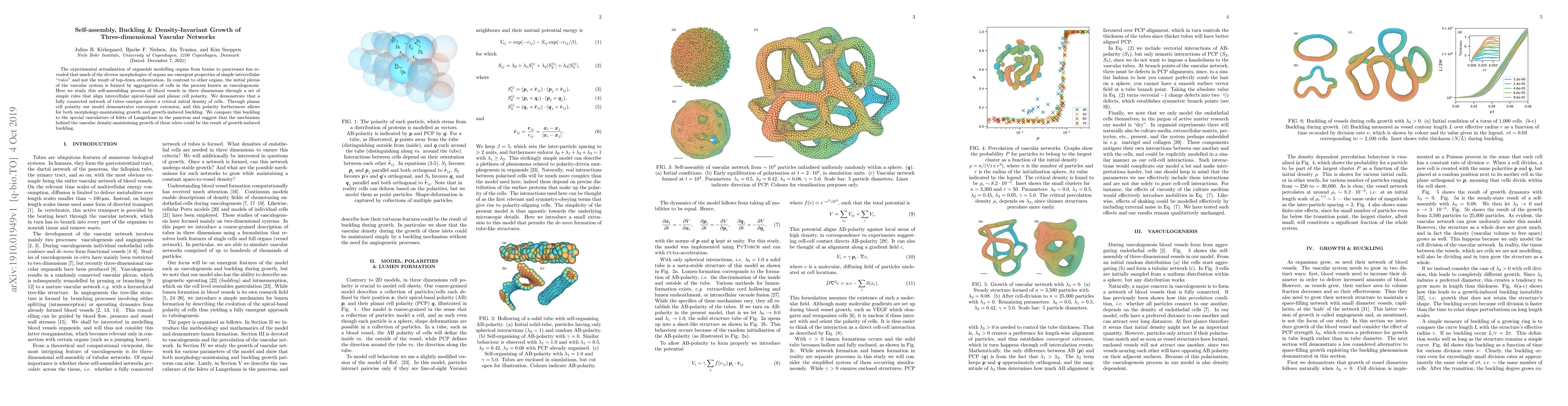 The experimental actualisation of organoids modelling organs from brains to pancreases has revealed that much of the diverse morphologies of organs are emergent properties of simple intercellular "rules" and not the result of top-down orchestration. In contrast to other organs, the initial plexus of the vascular system is formed by aggregation of cells in the process known as vasculogenesis. Here we study this self-assembling process of blood vessels in three dimensions through a set of simple rules that align intercellular apical-basal and planar cell polarity. We demonstrate that a fully connected network of tubes emerges above a critical initial density of cells. Through planar cell polarity our model demonstrates convergent extension, and this polarity furthermore allows for both morphology-maintaining growth and growth-induced buckling. We compare this buckling to the special vasculature of Islets of Langerhans in the pancreas and suggest that the mechanism behind the vascular density-maintaining growth of these islets could be the result of growth-induced buckling.