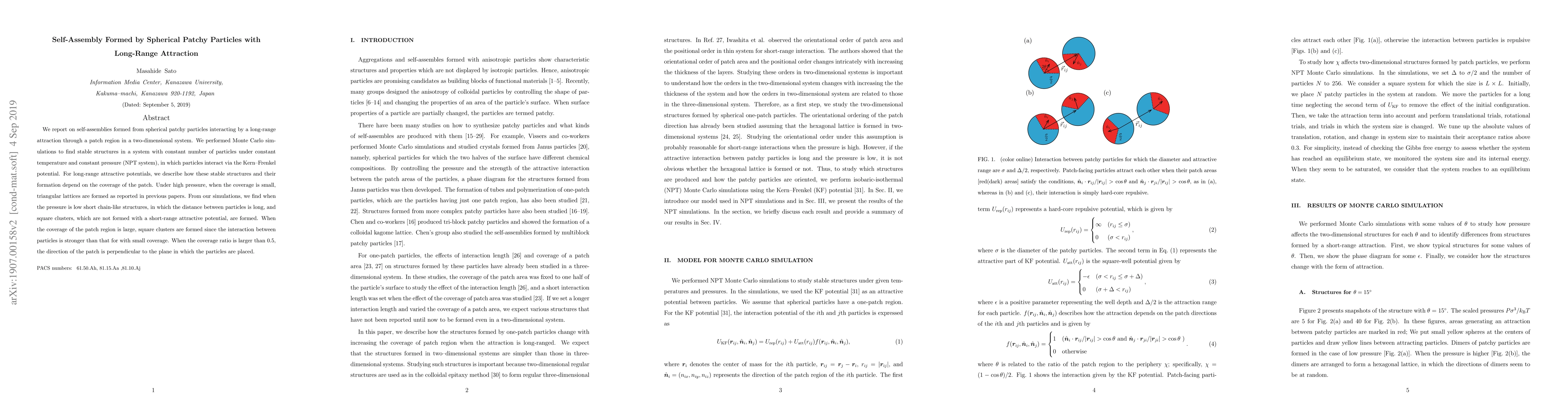 We report on self-assemblies formed from spherical patchy particles interacting by a long-range attraction through a patch region in a two-dimensional system. We performed Monte Carlo simulations to find stable structures in a system with constant number of particles under constant temperature and constant pressure (NPT system), in which particles interact via the Kern--Frenkel potential. We also performed Brownian dynamics simulations employing an interaction potential similar to the Kern--Frenkel potential to study the formation of those structures. For long-range attractive potentials, we describe how these stable structures and their formation depend on the coverage of the patch. Under high pressure, when the coverage is small, triangular lattices are formed as reported in previous papers. From our simulations, we find when the pressure is low short chain-like structures, in which the distance between particles is long, and square clusters, which are not formed with a short-range attractive potential, are formed. When the coverage of the patch region is large, square clusters are formed since the interaction between particles is stronger than that for with small coverage When the coverage ratio is larger than 0.5, the direction of the patch is perpendicular to the plane in which the particles are placed.