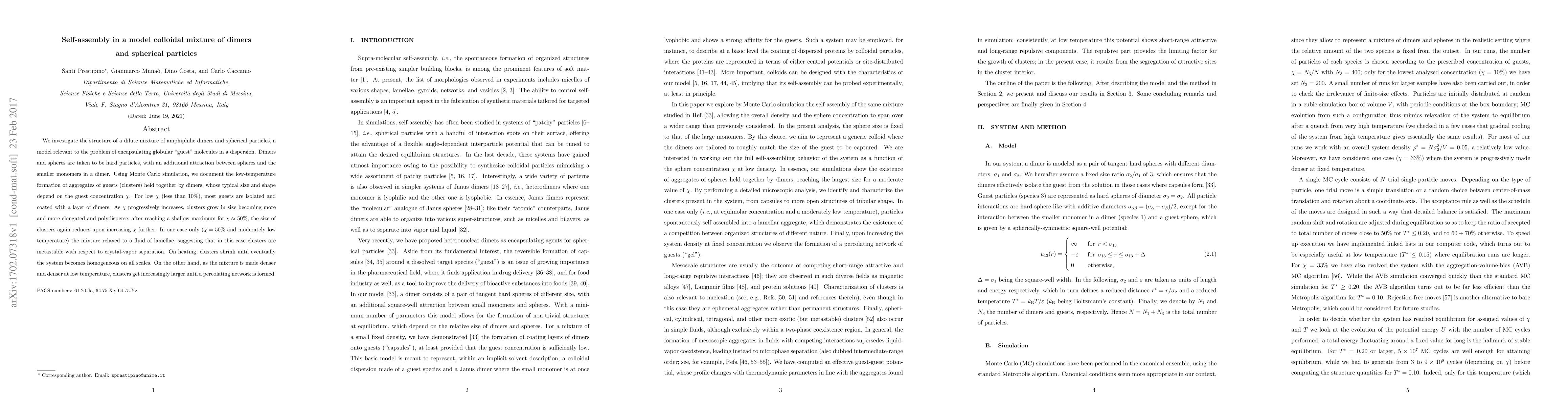 We investigate the structure of a dilute mixture of amphiphilic dimers and spherical particles, a model relevant to the problem of encapsulating globular "guest" molecules in a dispersion. Dimers and spheres are taken to be hard particles, with an additional attraction between spheres and the smaller monomers in a dimer. Using Monte Carlo simulation, we document the low-temperature formation of aggregates of guests (clusters) held together by dimers, whose typical size and shape depend on the guest concentration $\chi$. For low $\chi$ (less than $10\%$), most guests are isolated and coated with a layer of dimers. As $\chi$ progressively increases, clusters grow in size becoming more and more elongated and polydisperse; after reaching a shallow maximum for $\chi\approx 50\%$, the size of clusters again reduces upon increasing $\chi$ further. In one case only ($\chi=50\%$ and moderately low temperature) the mixture relaxed to a fluid of lamellae, suggesting that in this case clusters are metastable with respect to crystal-vapor separation. On heating, clusters shrink until eventually the system becomes homogeneous on all scales. On the other hand, as the mixture is made denser and denser at low temperature, clusters get increasingly larger until a percolating network is formed.