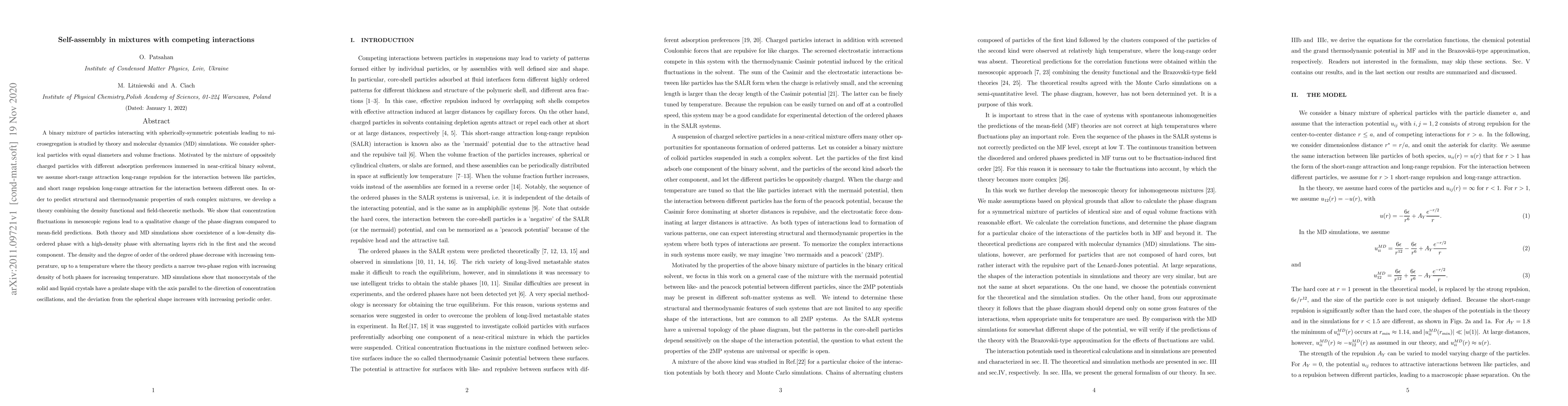 A binary mixture of particles interacting with spherically-symmetric potentials leading to microsegregation is studied by theory and molecular dynamics (MD) simulations. We consider spherical particles with equal diameters and volume fractions. Motivated by the mixture of oppositely charged particles with different adsorption preferences immersed in near-critical binary solvent, we assume short-range attraction long-range repulsion for the interaction between like particles, and short range repulsion long-range attraction for the interaction between different ones. In order to predict structural and thermodynamic properties of such complex mixtures, we develop a theory combining the density functional and field-theoretic methods. We show that concentration fluctuations in mesoscopic regions lead to a qualitative change of the phase diagram compared to mean-field predictions. Both theory and MD simulations show coexistence of a low-density disordered phase with a high-density phase with alternating layers rich in the first and the second component. The density and the degree of order of the ordered phase decrease with increasing temperature, up to a temperature where the theory predicts a narrow two-phase region with increasing density of both phases for increasing temperature. MD simulations show that monocrystals of the solid and liquid crystals have a prolate shape with the axis parallel to the direction of concentration oscillations, and the deviation from the spherical shape increases with increasing periodic order.