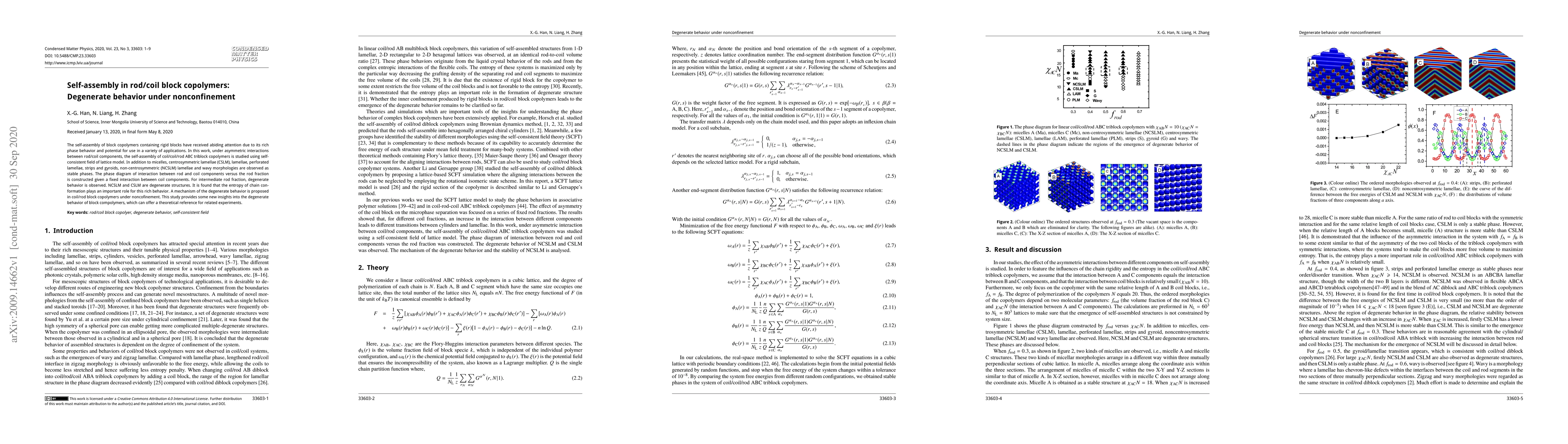 This study investigates the self-assembly of ABC triblock copolymers with rod/coil components, revealing a variety of stable phases including degenerate structures like non-centrosymmetric lamellae and centrosymmetric lamellae. The research proposes a mechanism for the observed degenerate behavior, emphasizing the role of entropy in chain conformation.