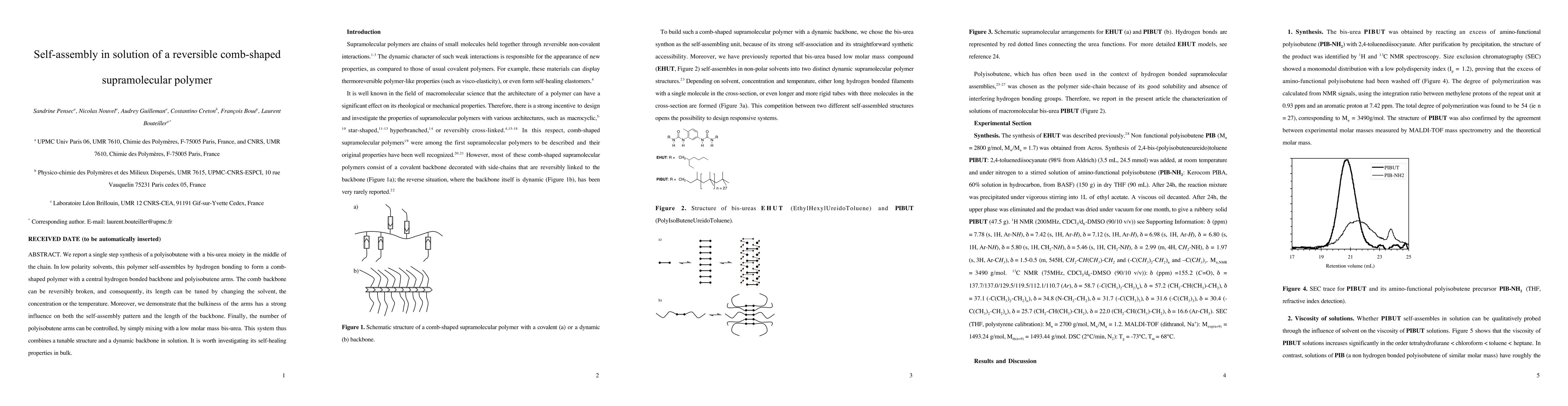 We report a single step synthesis of a polyisobutene with a bis-urea moiety in the middle of the chain. In low polarity solvents, this polymer self-assembles by hydrogen bonding to form a combshaped polymer with a central hydrogen bonded backbone and polyisobutene arms. The comb backbone can be reversibly broken, and consequently, its length can be tuned by changing the solvent, the concentration or the temperature. Moreover, we have proved that the bulkiness of the side-chains have a strong influence on both the self-assembly pattern and the length of the backbone. Finally, the density of arms can be reduced, by simply mixing with a low molar mass bis-urea.