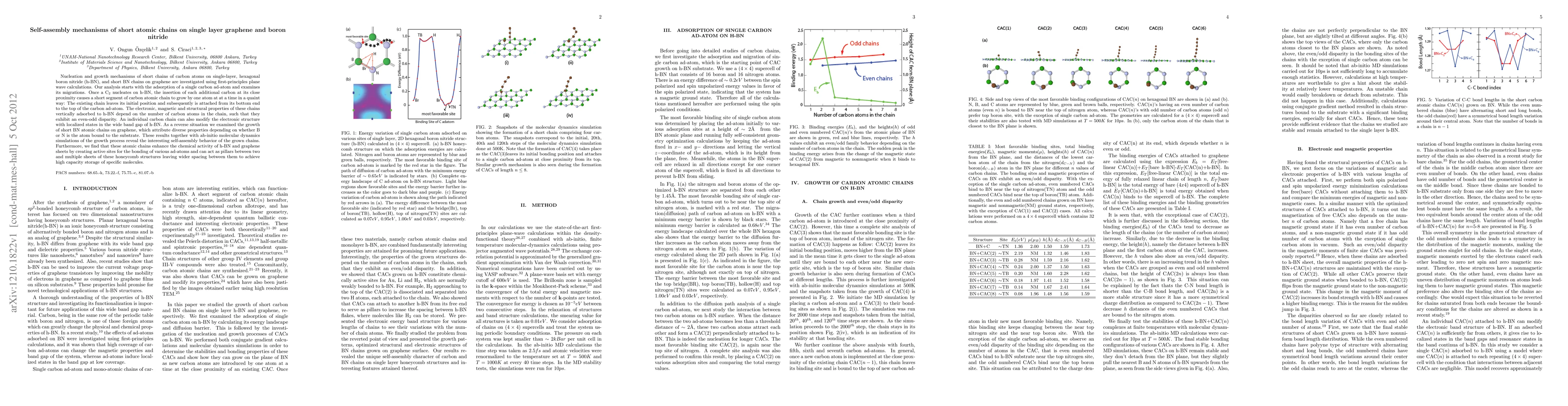 This paper investigates the nucleation and growth mechanisms of short carbon and boron nitride atomic chains on single-layer graphene and hexagonal boron nitride using first-principles calculations. It reveals that carbon chains on h-BN grow by detaching and reattaching, while BN chains on graphene exhibit diverse properties based on the atom bound to the substrate, highlighting the self-assembly behavior and potential for enhancing chemical activity and molecular storage.