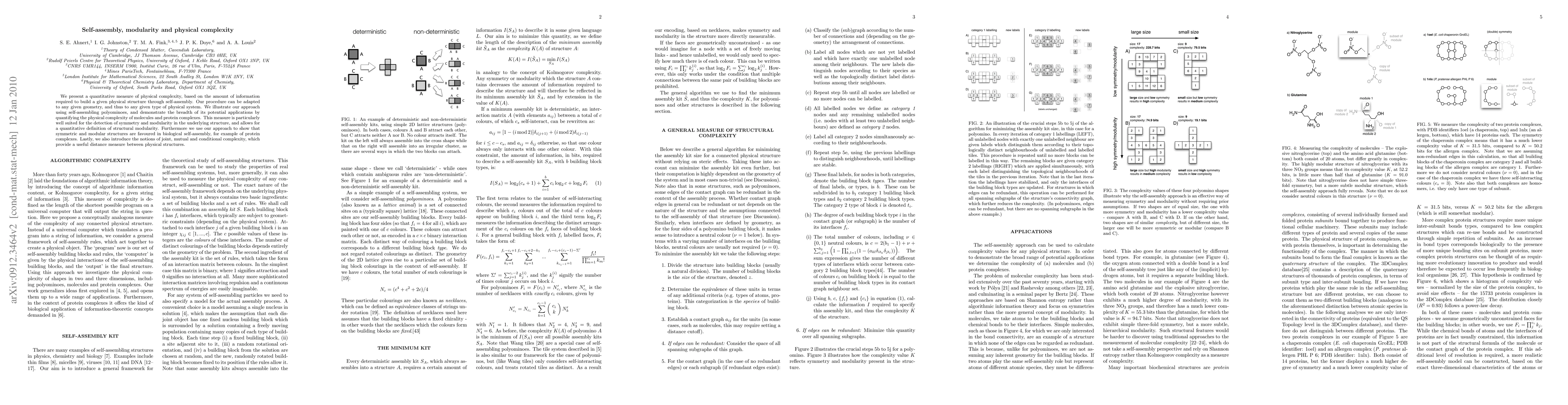 This paper introduces a quantitative measure of physical complexity based on self-assembly information, adaptable to various physical systems. It demonstrates the measure's application to polyominoes, molecules, and protein complexes, highlighting its utility in detecting symmetry and modularity, and showing that these traits are favored in biological self-assembly.