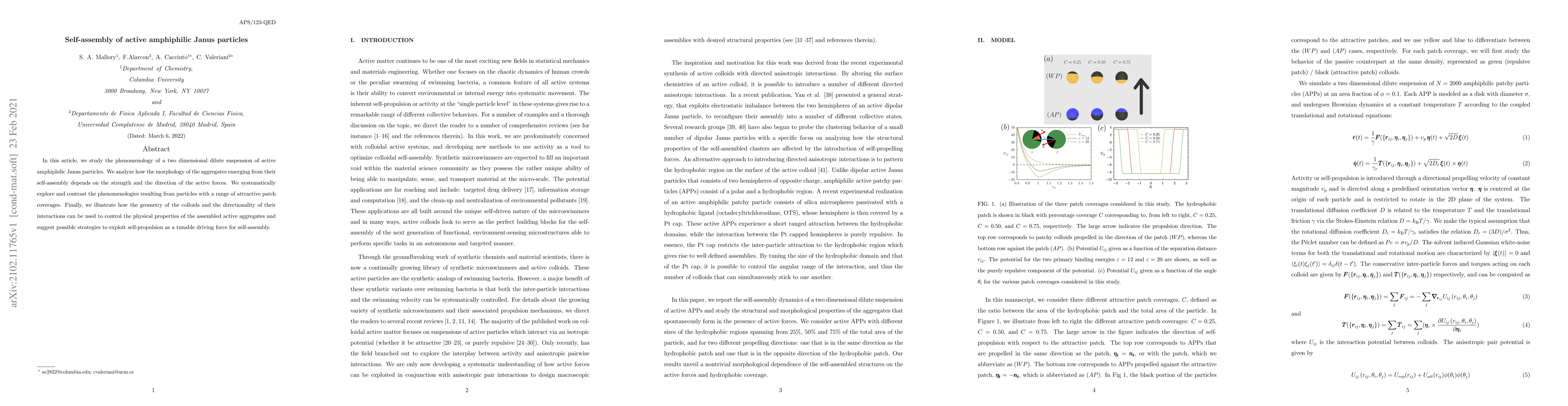 This paper explores the self-assembly behavior of active amphiphilic Janus particles in two-dimensional suspensions, analyzing how aggregate morphology varies with active force strength and direction. It proposes strategies to control aggregate properties through colloid geometry and directional interactions, suggesting potential applications of self-propulsion in tunable self-assembly processes.