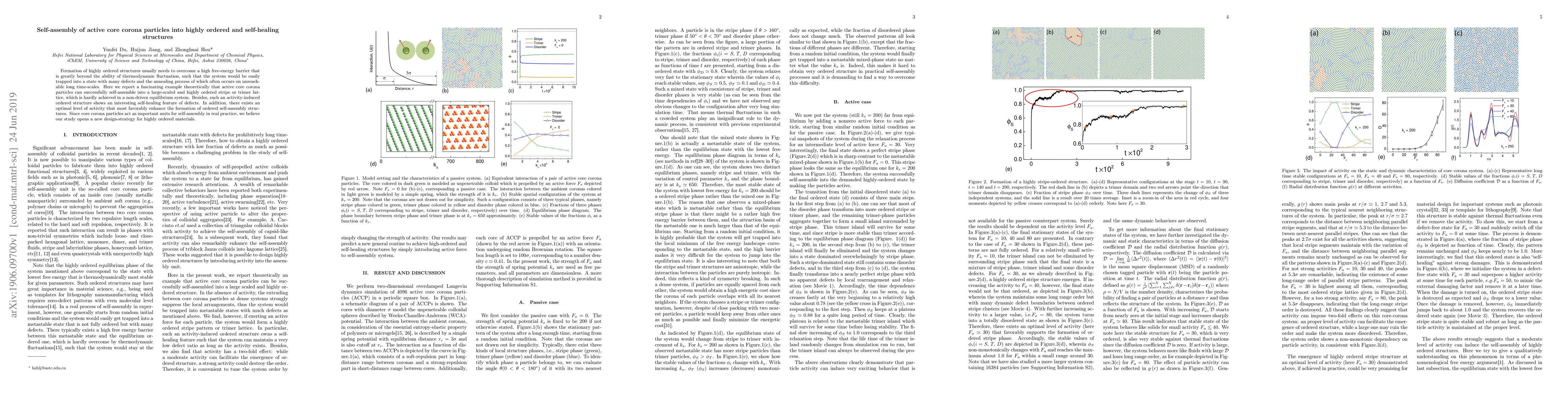 This paper demonstrates that active core corona particles can self-assemble into highly ordered, large-scale lattice structures, overcoming typical thermodynamic barriers, and exhibits self-healing properties. An optimal level of activity is identified to best enhance this ordered self-assembly, suggesting a new strategy for designing highly ordered materials.