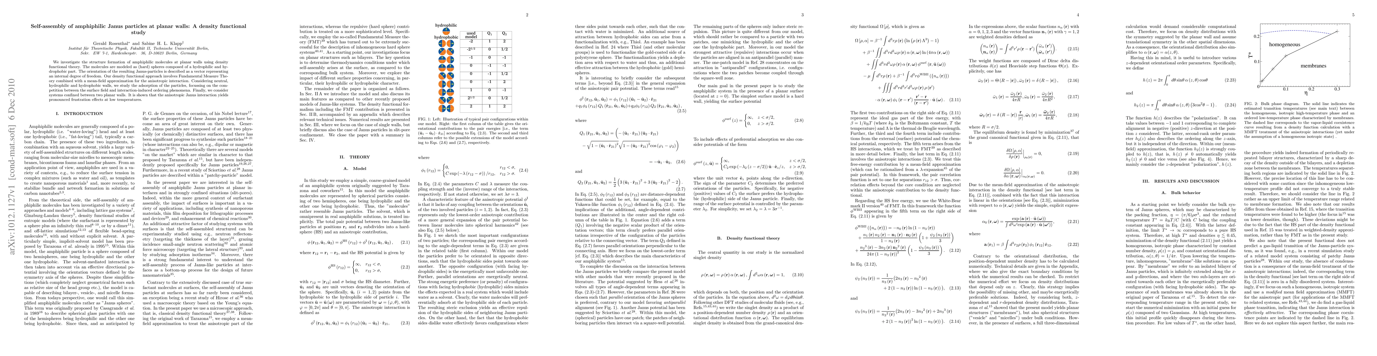 Researchers used density functional theory to study the self-assembly of amphiphilic Janus particles at planar walls, finding frustration effects at low temperatures.