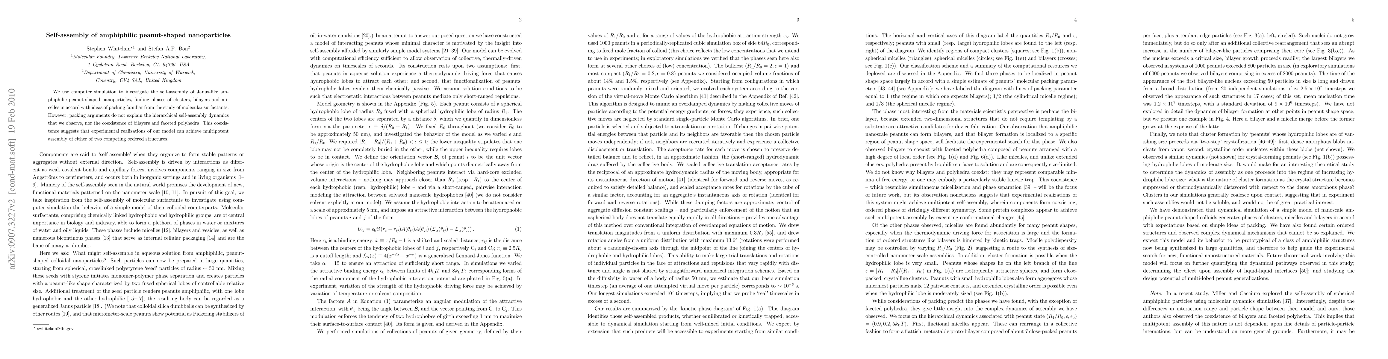 This study uses computer simulations to explore the self-assembly of amphiphilic peanut-shaped nanoparticles, revealing clusters, bilayers, and micelles. The observed hierarchical assembly dynamics and coexistence of bilayers and polyhedra suggest potential for multipotent assembly in experimental realizations.