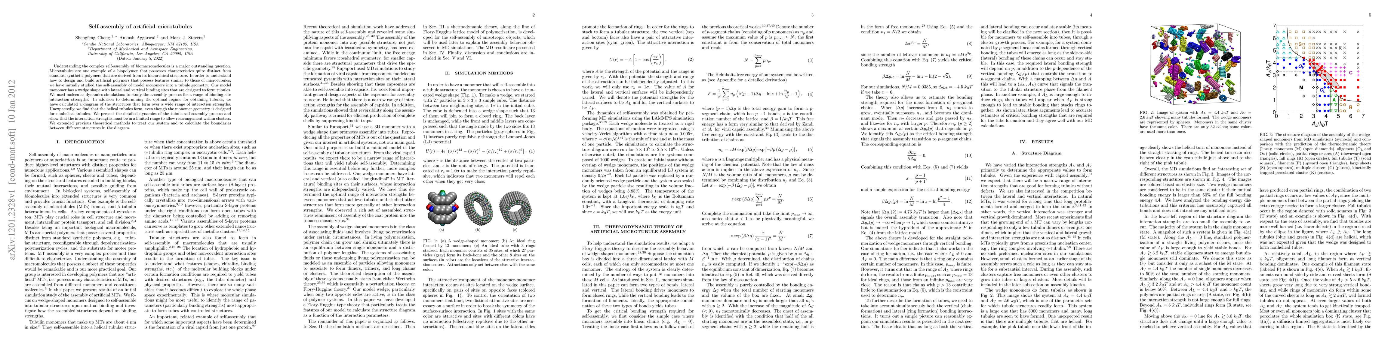 This paper investigates the self-assembly of artificial microtubules using wedge-shaped monomers with designed binding sites, revealing unexpected helical tubule formation despite nonhelical design. Molecular dynamics simulations identify optimal interaction strengths for tubule formation and extend theoretical methods to map structural boundaries.