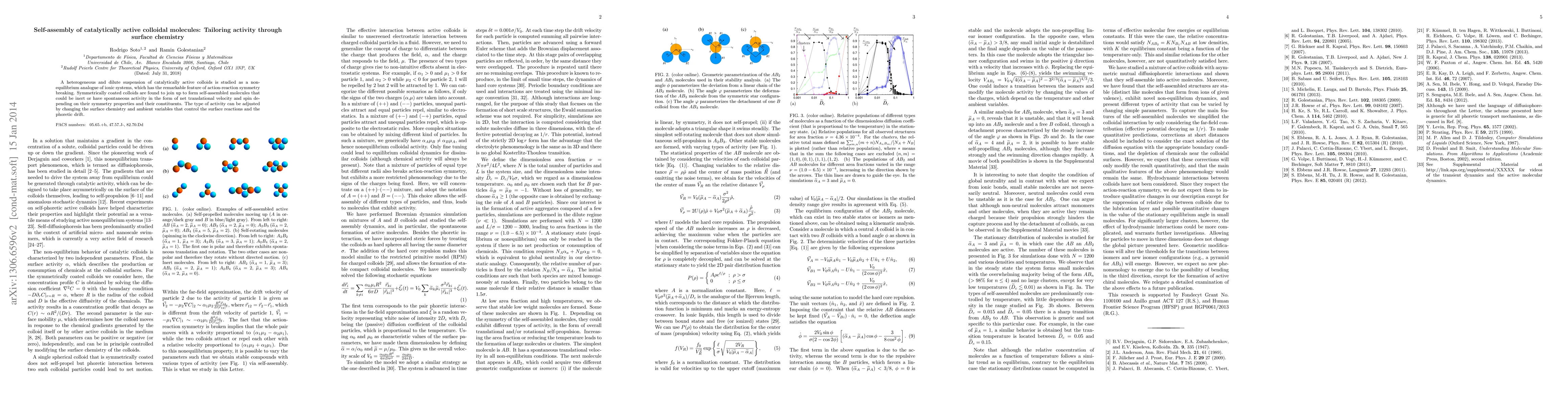 This paper explores the self-assembly of catalytically active colloids into molecules, demonstrating how their activity can be tailored through surface chemistry. The study reveals that symmetrically coated colloids form self-assembled entities with spontaneous activity, which can be adjusted based on surface reactions and ambient conditions.