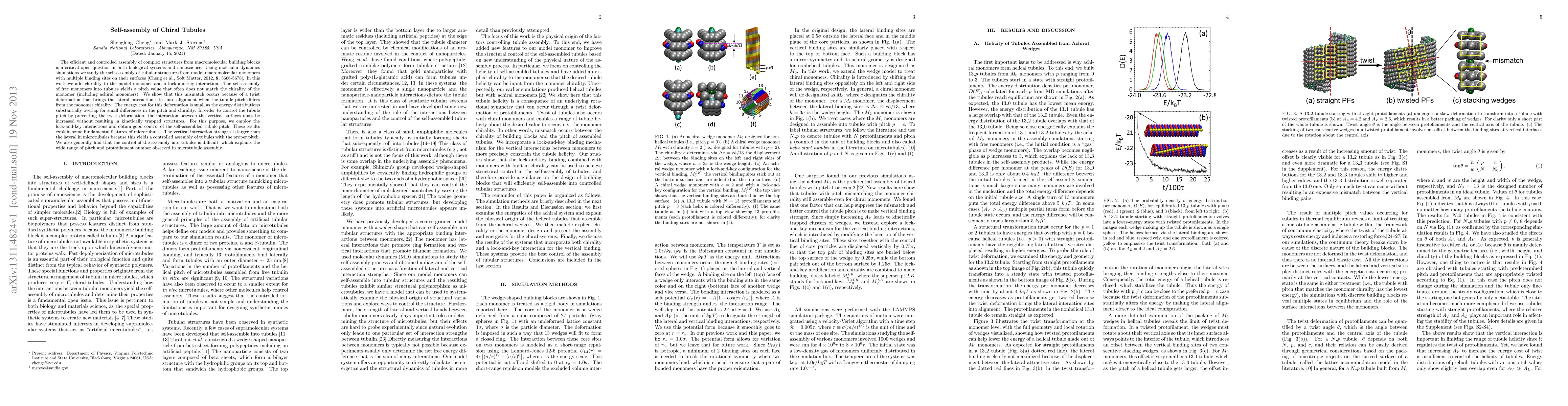 The efficient and controlled assembly of complex structures from macromolecular building blocks is a critical open question in both biological systems and nanoscience. Using molecular dynamics simulations we study the self-assembly of tubular structures from model macromolecular monomers with multiple binding sites on their surfaces [Cheng et al., Soft Matter 8, 5666-5678 (2012)]. In this work we add chirality to the model monomer and a lock-and-key interaction. The self-assembly of free monomers into tubules yields a pitch value that often does not match the chirality of the monomer (including achiral monomers). We show that this mismatch occurs because of a twist deformation that brings the lateral interaction sites into alignment when the tubule pitch differs from the monomer chirality. The energy cost for this deformation is small as the energy distributions substantially overlap for small differences in the pitch and chirality. In order to control the tubule pitch by preventing the twist deformation, the interaction between the vertical surfaces must be increased without resulting in kinetically trapped structures. For this purpose, we employ the lock-and-key interactions and obtain good control of the self-assembled tubule pitch. These results explain some fundamental features of microtubules. The vertical interaction strength is larger than the lateral in microtubules because this yields a controlled assembly of tubules with the proper pitch. We also generally find that the control of the assembly into tubules is difficult, which explains the wide range of pitch and protofilament number observed in microtubule assembly.