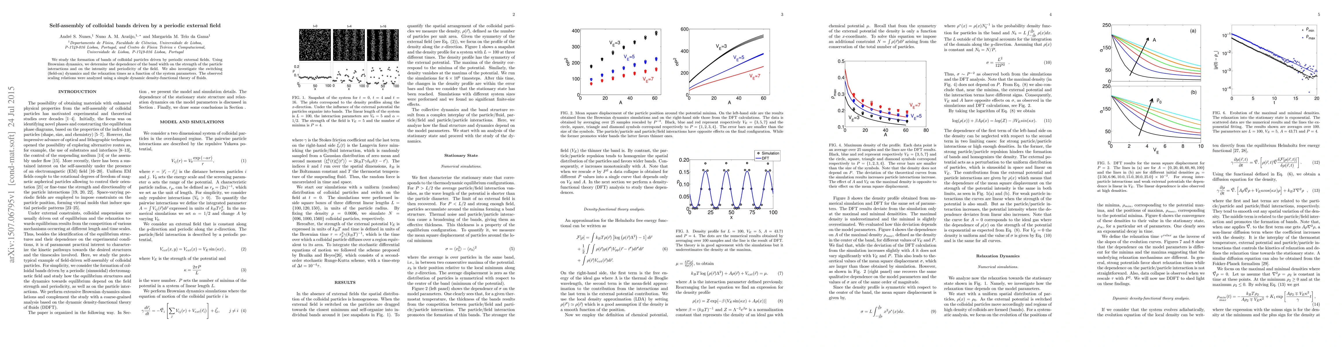 This research investigates how periodic external fields induce self-assembly of colloidal particles into bands, determining the band width's dependence on particle interactions and field parameters. The study also examines switching dynamics and relaxation times, using dynamic density-functional theory to analyze observed scaling relations.