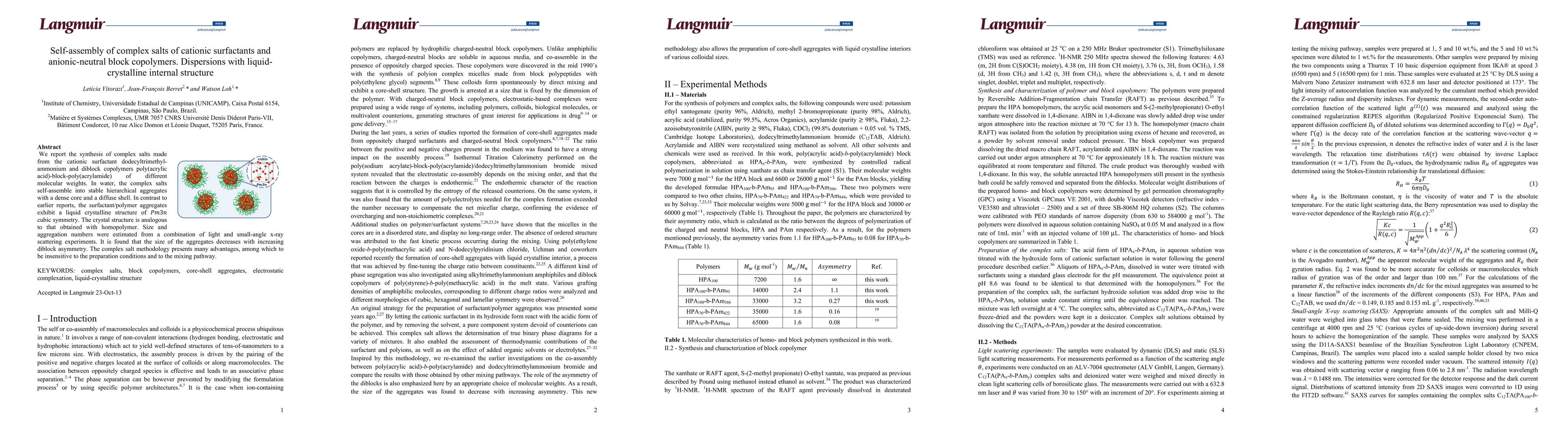 This paper reports the synthesis of complex salts from cationic surfactants and anionic-neutral block copolymers, which self-assemble into stable liquid-crystalline aggregates with Pm3n cubic symmetry. The aggregate size decreases with increasing block copolymer asymmetry, highlighting the method's advantages in preparation flexibility.