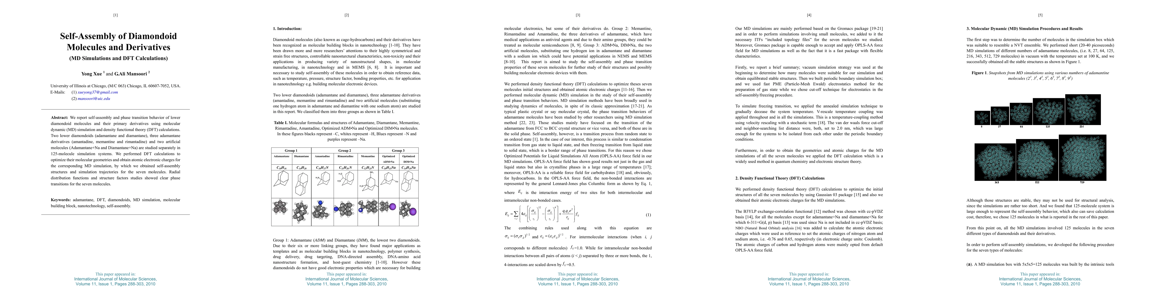 This research investigates the self-assembly and phase transition behaviors of lower diamondoid molecules and their derivatives using MD simulations and DFT calculations. The study reveals distinct phase transitions in systems comprising adamantane, diamantane, and their derivatives, as evidenced by radial distribution functions and structure factors.